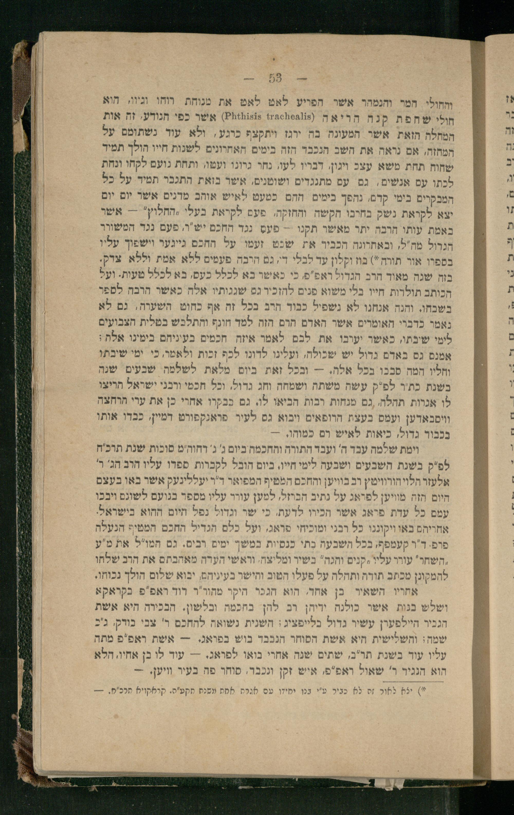 והחולי המר והנמהר אשר הפויע לאמ לאט את מנוחת רוחו וגיווו הוא חולי שחפת קנה ה ריא ה(8הספסהינו 8הותזמם) אשר כפי הנודע, זה אות המחלה הזאת אשר. המעונה. בה יוגז 2 כרגע, ולא עוד נשתומם על המחזה, אם נראה את השב הנכבר הזה בימים האחרונים לשנות חייו הולך תמיד שחוח תחת משא עצכ ויגון, דבריו לעו, נחר גרונו ועטו, ותחת גועם לקחו ונחת לכתו עם אנשים, גם עם מתנגדים ושוטנים, אשר בואת התגבר תמיר על כל המבקרים בימי קדם, נהפך בימים החם כמעט לאיש אוהב מדנים אשר יום יום יא לקראת נשק בחרבו הקשה והחזקה, פעם לקראת החלוץ'-- אשר באמת עותו הרבה יתר מאשר תקנו- פעם נגד החכם יש"ר, פעם נגד המשורר הגרול מח"ל, ובאתרונה הכביר את שנט זעמו על החכם גייגער וישפוך עליו בספרו אור תורה*) בוז וקלון עד לבלי די, גם הרבה פעמים לפא אמת וללא צרק. בזה שגה מאוד הרב הגדול ראפ"פ, כי כאשר בא לכלל כעם, בא לכלל טעות. ועל הכותב תולרות חייו בלי משוא פנים להזכיר גס שגגותיו אלה כאשר הרבה לספר בשבחו. וחנה אנחנו לא נשפיל כבוד הרב בכל זה אף כחוט השעוה, גם לא נאמר כדברי האומרים אשר הארם הרם הזה למד חונף והתלבש בטלית הצבועים לימי שיבתו, כאשר יעובו את לבם לאמר איזה חכמים בעיניחם בימינו אלה: אמנם גם באדם גדול יש שכולה, ועלינו לדונו לכף זכות ולאמר, כי. ימי שיבתו וחליו המה סבכו בכל אלה.-- ובכל זאת ביוס 0 לשלמה שבעים שנה בשנת כת'ר לפ"ק עשה משתה ושמחה וחג גדול, וכל חכמי ורבני ישראל חריצו לו אגרות תהלה, ,גם מנחות רבות הביאו לו. גם בבקרו אחרי כן את ערי הרחצה וויסבאדען ועמס בעצת הרופאים ויבוא גם לעיר פואנקפורט המי כבדו אותו בכבור גדול, כיאות לאיש רם כמוהו,