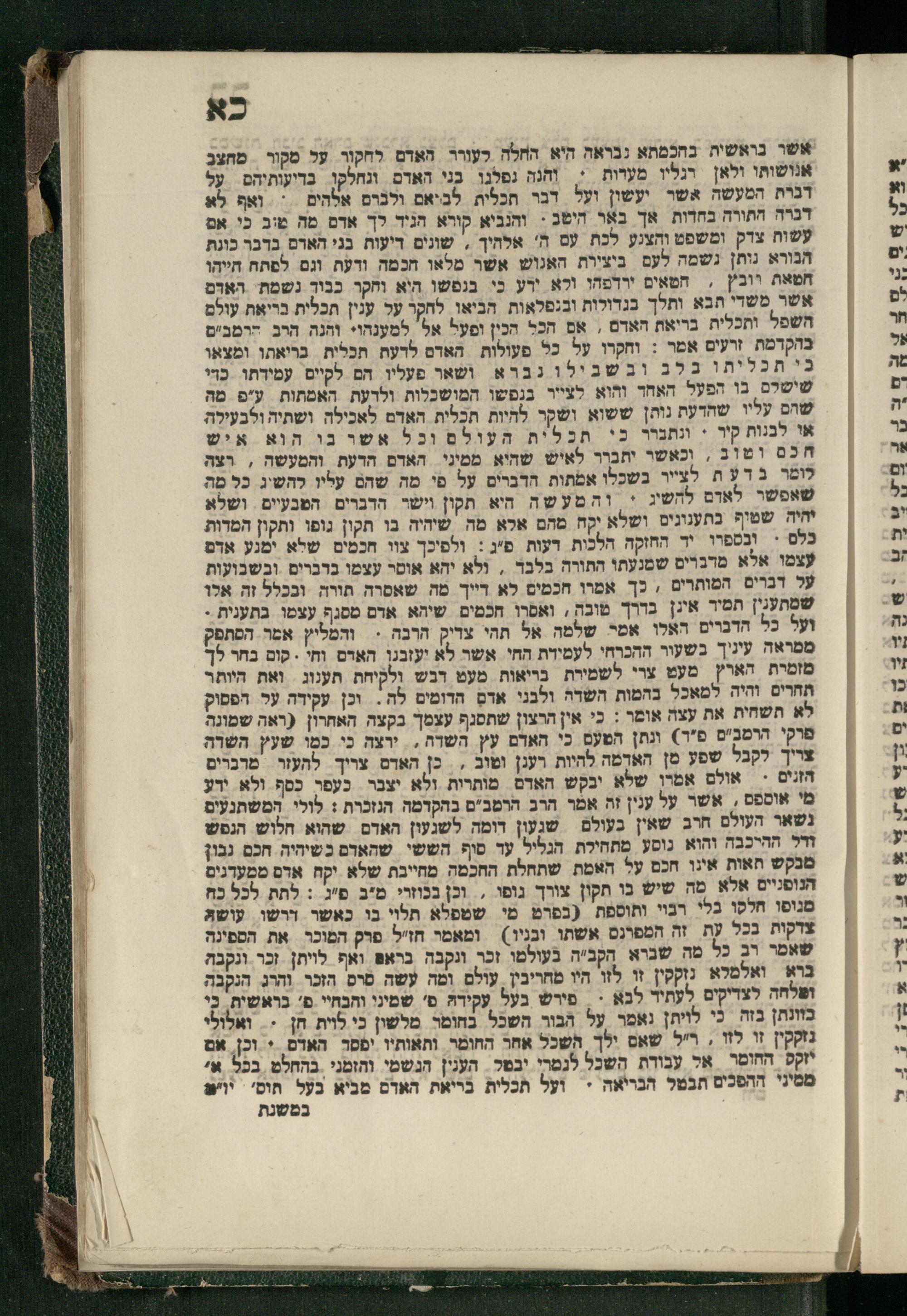אשר נואשיה בהכמתא נבראה היא החלה כעורר האדם לחקור על מקור| מחצב אנושותו ולאן| רגלין מערות', והנה נפלגו בני האדם ונחלקו בדיעותיהם על דנרת המעשה אשר יעשון ועל דבר תכלית לביאם ולברם אלהים|| ואף לא דברה חתורה בחדות אך באר הימכ. והנביא קורא הגיר לך אדם מה מוב כי אם עשות צדק ומשפט והצנע לכת עם ה' אלהיך, שונים דיעות בני הארם בדבר כונת הנורא נותן נשמה לעם ביצירת האנוש אשר מלאו חכמה ודעת וגם לפתח חייהו חטאת וובץ, חטאים ירדפהו ולא ירע כי בנפשו היא וחקר כבור נשמת האדם אשר משדי הבא ותלך בגדולות ובנפלאות. הביאו לחקר על ענין תכלית בריאת עולם השפל ותכלית בריאת האדם, אם הכל הכין ופעל אל למענהוי והגה. הרב. הרמב"ם בהקדמת זרעים אמר: וחקרו על כל פעולות האדם לדעת תכלית בריאתו ומצאו בי תכליתו בלב וב שבילו נברא ושאר פעליו הם לקיים עמידתו כרי שישלם בו הפעל האחד והוא לצייר בנפשו המושכלות ולדעת האמתות ע"ם מה שהם ליו שהדעת נותן ששוא ושקר להיות תכלית האדם לאכילה. ושתיה ולבעילה או לננות קיר+ נתנרר כי תכלית העולם וכל אשו בו הוא איש הס וטונ, וכאשר יתברר לאיש שהיא ממיני האדם הדעת והמעשה, רצה לומר ב דעת לצ"ר בשכלו אמתות הדברים על פי מה שהם עליו להשיג. כל מה שאפשר לאדם להשיג' והמעשה היא תקון וישר הדברים הטבעיים. ושלא יהיה. שמיף בתענוגים ושלא יח מהם אלא מה שיהיה בו תקון נופו. ותקון המדות כלם| ונספרו יר החזקה הלכות דעות פיג:. ולפיכך צוו חכמים. שלא ימגע אדם עצמו אלא מדברים שמנעתו התורה בלבד, ולא יהא אוסר עצמו ברברים ובשבועות על דברים המותרים, כך אמרו חכמים לא דייך מה שאסרה תורה ובכלל זה אלו שמתענין תמיר אינן בדרך טובה, ואסרו חכמים שיהא אדם מסגף עצמו בתענית ועל כל הדבוים האלו אמר שלמה אל תהי צריק הרבה> והמליץ אמר הסתפק ממראה עינ'ך בשעור ההכרחי לעמידת החי. אשר לא יעזבנן האדם וחי. קום בחר לך מזמית הארץ מעט צרי לשמירת בריאות מעט דבש ולקיחת תענוג ואת היותר תחרים והיה למאכל בהמות השדה ולבני אדם הדומים לה. וכן עקידה על הפסוק לא השחית את עצה אומר: כי אין הרצון שתסנף עצמך בקצה האחרון(ראה שמונה פרקי הרמב'ם פ"ר) ונתן הטעס כי האדם עץ השדה, ירצה כי כמו שעץ השרה צריך. לקבל שפע מן האדמה להיות רענן וטוב, כן האדם צריך להעזר| מרברים הזנים. אולם אמרו שלא יבקש האדם מותרות ולא יצבר כעפר כסף ולא ירע מי אוספם ,, אשר על ענין זה אמר הרב הרמב'ם בהקדמה הנזכרת: לולי. המשתנעים נשאר העולם חרב שאין בעולם= שגעון דומה לשגעון האדם שהוא חלוש הנפש ודל ההיכבה והוא נוסע מתחילת הגליל, עד סוף הששי שהאדם כשיהיה חכם נבון פנקש חאות אינו חכם על האמת שתחלת החכמה מחייבת שלא יקח אדם ממעדנים הנופניים אלא מה שיש בו תקון צורך גופו ,. וכן בכוזרי. מ'ב פ"ג.: לחת לכל כח מנוסו חלקו בלי רבוי ותוספת(בפרט מי שמפלא תלוי בו כאשר ורשו עושא צדקות בכל עת זה המפוגם אשתו ובניו) ומאמר חז'ל פרק המוכר את הספינה שאמר רב כל מה שברא הקב"ה בעולמו זכר ונקבה בראף ואף לויתן זכר ונקבה ברא ואלמלא נזקקין זו לזו היו מחריבין עולם ומה עשה סרס הזכר והרג הנקבה ושלחה לצדיקים לעתיד לבא>| פירש בעל עקידה ם' שמיני והבחיי פ' בראשית, כַי בזונתן בזה. כי לויתן נאמר על הבור השכל בחומר מלשון כי לוית חן><. ואלולי נזקקין זו לזו, ריל שאם ילך השכל אחר החומר ותאותיו יפסר. האדם,+ וכן, אם יזקס החומר= אל עבודת השכל לנמרי יבפל. הענין הגשמי והזמני בהחלט בכל א' ממני ההפכים תבטל הבריאה+ ועל תכלית בריאת האדם מביא בעל תוס' יו"ש במשנת