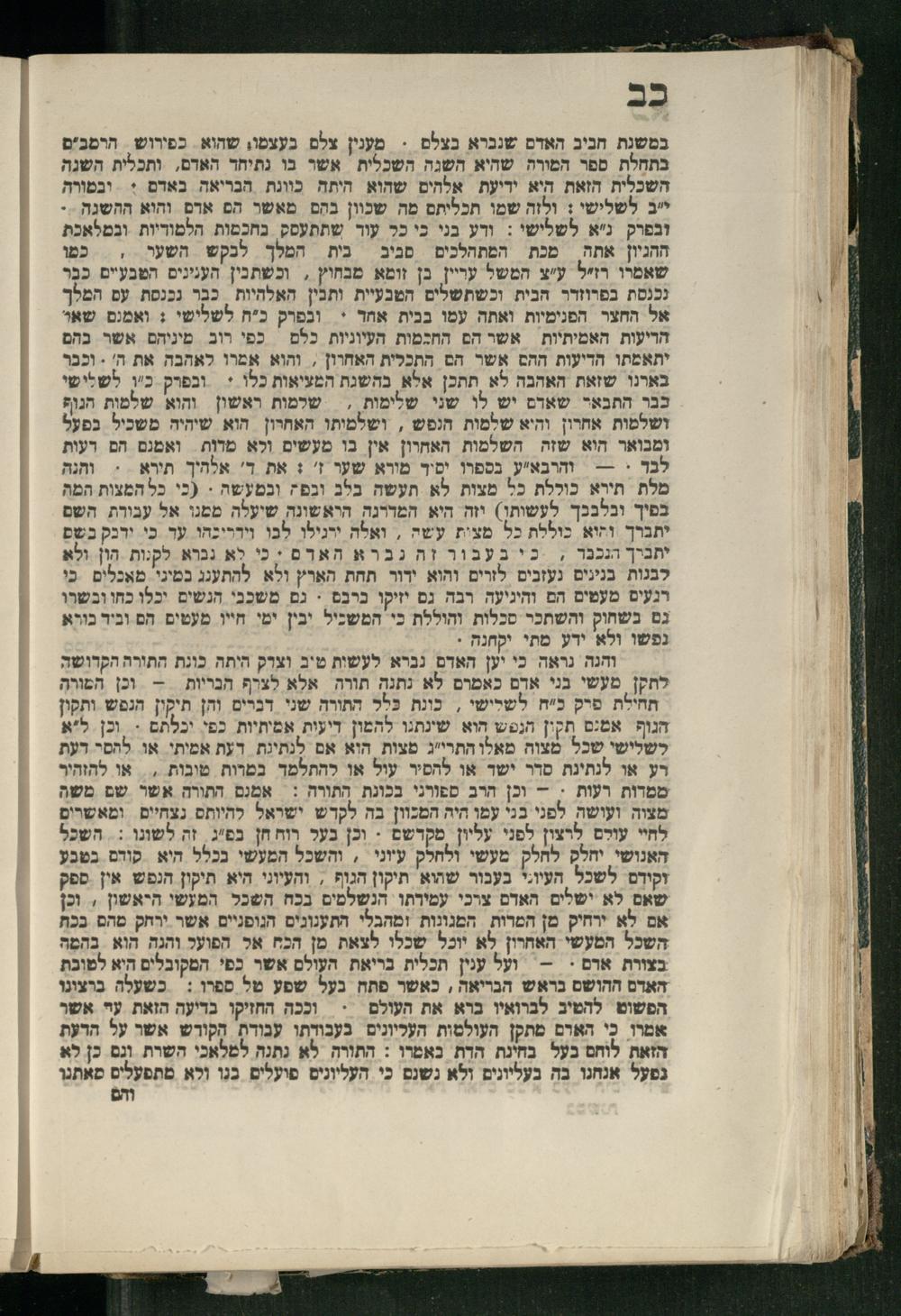במשנת חביב האדם שנברא בצלם. מענין צלם בעצמו, שהוא כפירוש הרמב'ם בתחלת ספר המורה שהיא השגה השכלית אשר בו נתיחר האדם, ותכלית השגה השכלית הזאת היא ידיעת אלהים שהוא היתה כוונת הבריאה באדם| ובמורת ייב לשלישי: ולזה שמו תכליתם מה שכוון בהם מאשר הם אדם והוא ההשגה-ובפרק נ"א לשלישי: ודע בני בי כל עור שתתעסק בחכמות הלמוריות. ובמלאבת ההגון אתה מכת המתהלכים| סביב| בת המלך לבקש השעי ,| כמו שאמרו רז"ל ע"צ המשל עריין בן זומא מבחוץ, וכשתבין הענינים הטבעיים כבֶר נכנסת בפרוזרר הבית וכשתשלים המבעיית ותבין האלהיות כבר נכנסת עם המלך אל החצר המנימיות ואתה עמו בבית אחר' ובפרק כ"ח לשלישי: ואמנם שאו הריעות האמיתיות| אשר הם החכמות העיוניות כלם| כפי רוב מיניהם אשר בהם יתאמתו הדיעות ההם אשר הם התכלית האחוון, והוא אמרו לאהבה את ה'. וכבר בארנו שזאת האהבה לא תתכן אלא בהשגת המציאות כלו* ובפרק כ"ו לשלישי בבר התבאר שאדם יש לו שני שלימות,| שלמות ראשון והוא שלמות הגו ושלמות אחרון והיא שלמות הנפש, ושלמותו האחרון הוא שיהיה משכיל בפעל ומבואר הוא שזה השלמות האחרון אין בו מעשים ולא מדות ואמגם הם רעות לבד|-- והרבא"ע בספרו יסיך מורא שעו ז': את ד' אלהיך תירא|| ונה מלת תירא כוללת כל מצות לא תעשה בלב ופה ובמעשה><(כי כלהמצות המת בפיך ובלבכך לעשותו) יזה היא המדרגה היאשונה שיעלה ממנו אל עבורת השם יתברך והוא כוללת כל מצות עשה, ואלה ירגילו לבו וידריכהו עד כי ירבק בשם יתברך הנכבד , כי בעבור זה נברא הארםיכי לא נברא לקנות הון ולא לבנות בנינים נעזבים לזרים והוא ירור תחת הארץ ולא להתענג במיני מאכלים כו רגעים מעטים הם והיגיעה רבה גם יזיקו ברבם+ גם. משכבי הנשים יכלו כחו ובשרו גם בשחוק והשתכר סכלות והוללת כי המשכיל יבין ימי חייו מעטים הם וביד בורא נפשו ולא ירע מתי יקחנה