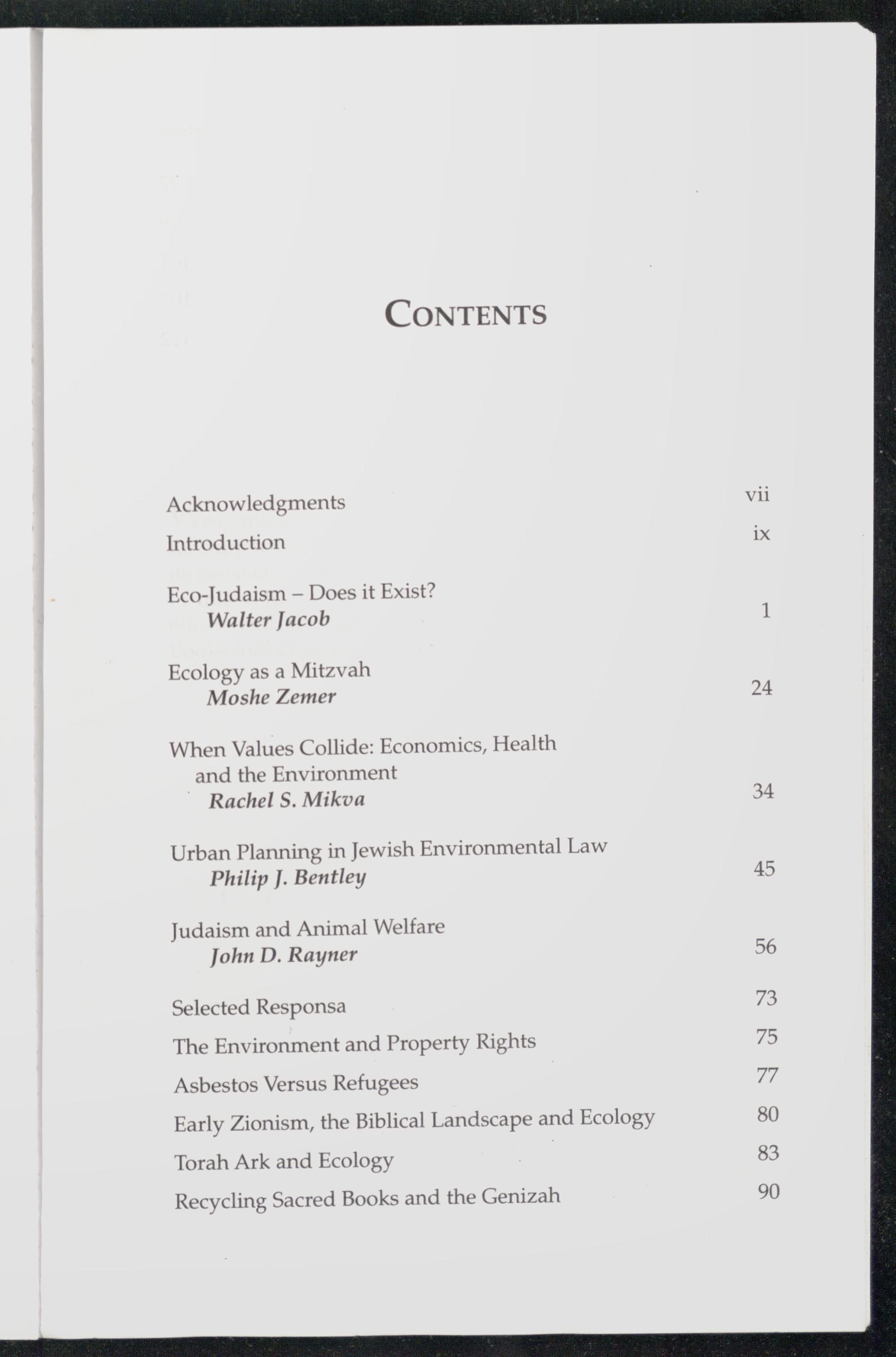 Judaism and Animal Welfare John D. Rayner Selected Responsa The Environment and Property Rights Asbestos Versus Refugees Early Zionism, the Biblical Landscape and Ecology Torah Ark and Ecology