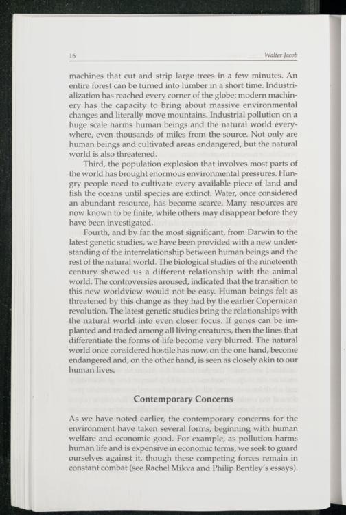 As we have noted earlier, the contemporary concerns for the environment have taken several forms, beginning with human welfare and economic good. For example, as pollution harms human life and is expensive in economic terms, we seek to guard ourselves against it, though these competing forces remain in constant combat(see Rachel Mikva and Philip Bentley's essays).
