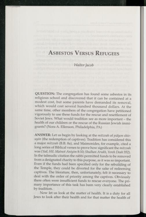 QUESTION: The congregation has found some asbestos in its religious school and discovered that it can be contained at a modest cost, but some parents have demanded its removal, which would cost several hundred thousand dollars. At the same time, other members of the congregation have petitioned vigorously to use these funds for the rescue and resettlement of Soviet Jews . What would tradition see as more important— the health of our children or the rescue of the Russian Jewish immigrants?(Nora A. Ellenson, Philadelphia , PA )