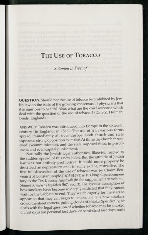 QUESTION: Should not the use of tobacco be prohibited by Jew ish law on the basis of the growing consensus of physicians that it is injurious to health? Also, what are the chief responsa which deal with the question of the use of tobacco?(Dr. S.Z. Hulman, Leeds , England)