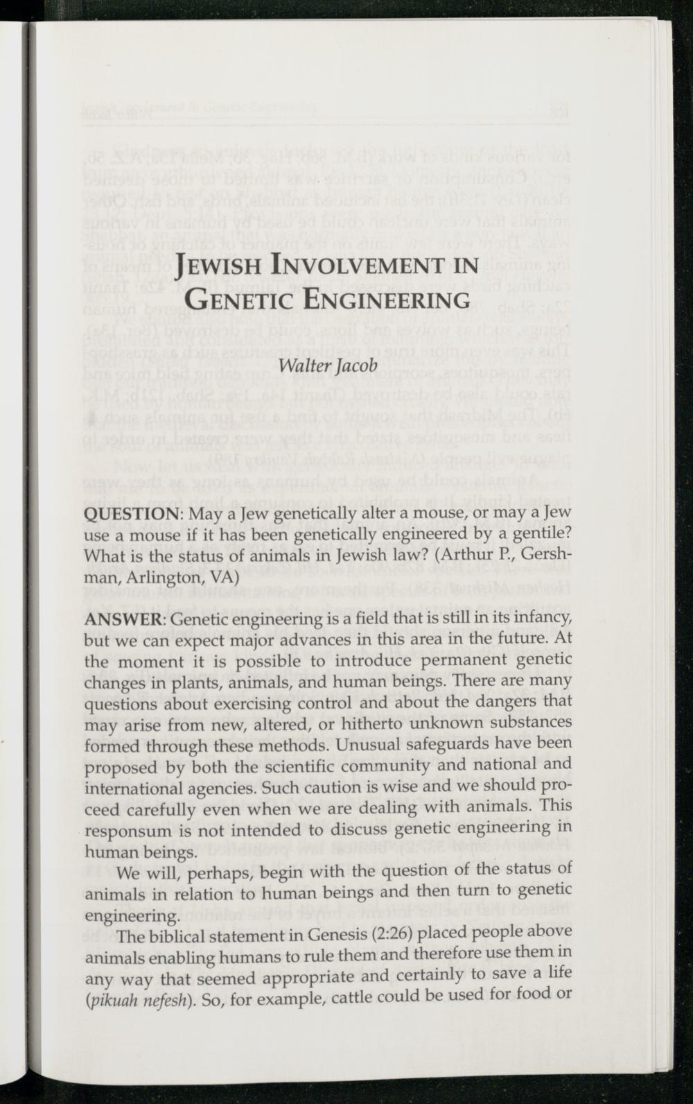 ANSWER: Genetic engineering is a field that is still in its infancy, but we can expect major advances in this area in the future. At the moment it is possible to introduce permanent genetic changes in plants, animals, and human beings. There are many questions about exercising control and about the dangers that may arise from new, altered, or hitherto unknown substances formed through these methods. Unusual safeguards have been proposed by both the scientific community and national and international agencies. Such caution is wise and we should proceed carefully even when we are dealing with animals. This responsum is not intended to discuss genetic engineering in human beings.