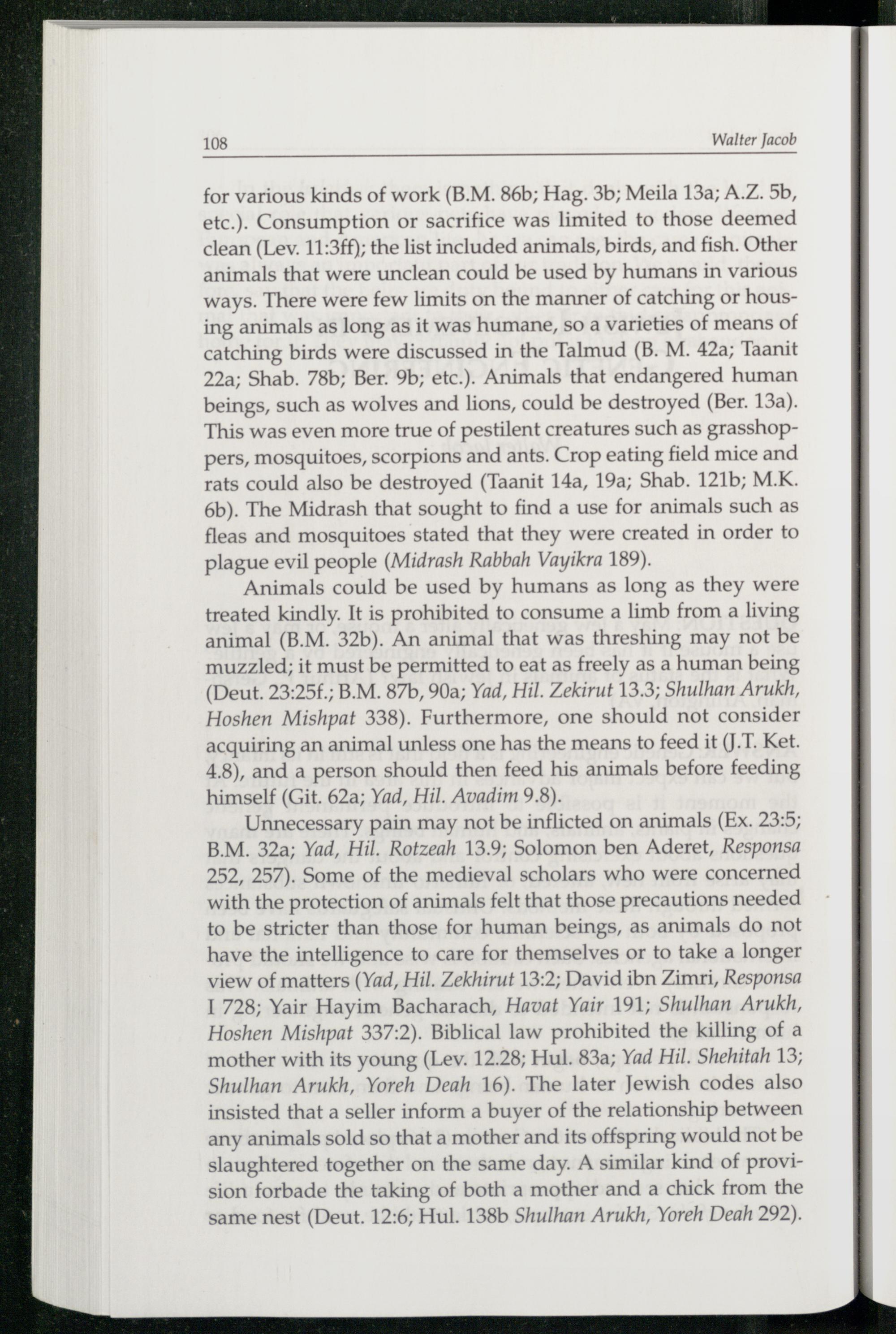 for various kinds of work(B.M. 86b; Hag. 3b; Meila 13a; A.Z. 5b, etc.). Consumption or sacrifice was limited to those deemed clean(Lev. 11:3ff); the list included animals, birds, and fish. Other animals that were unclean could be used by humans in various ways. There were few limits on the manner of catching or housing animals as long as it was humane, so a varieties of means of catching birds were discussed in the Talmud (B. M. 42a; Taanit 22a; Shab. 78b; Ber. 9b; etc.). Animals that endangered human beings, such as wolves and lions, could be destroyed(Ber. 13a). This was even more true of pestilent creatures such as grasshoppers, mosquitoes, scorpions and ants. Crop eating field mice and rats could also be destroyed(Taanit 14a, 19a; Shab. 121b; M.K. 6b). The Midrash that sought to find a use for animals such as fleas and mosquitoes stated that they were created in order to plague evil people(Midrash Rabbah Vayikra 189).
