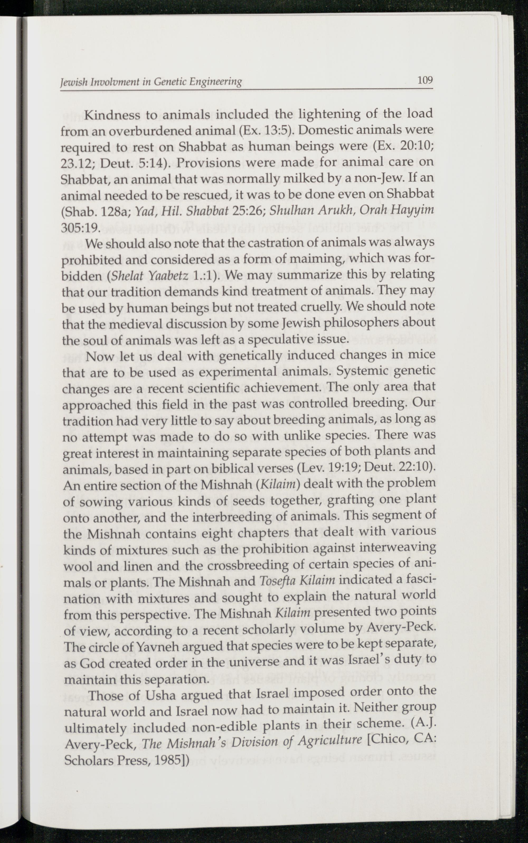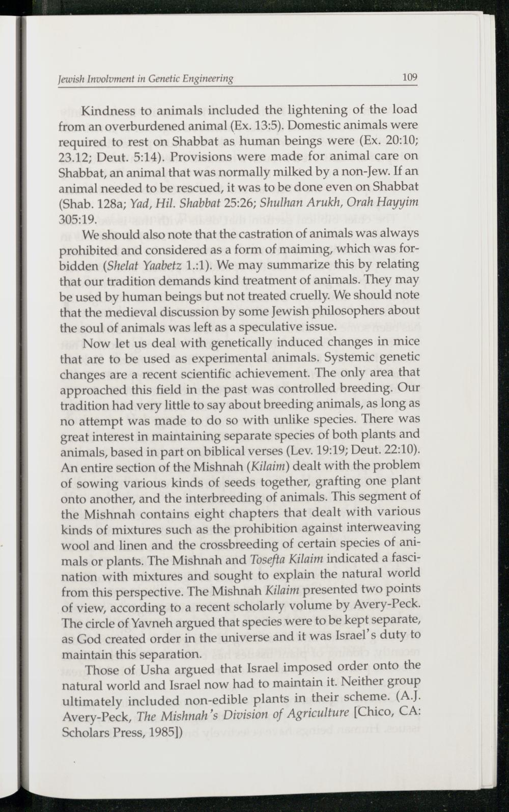 Now let us deal with genetically induced changes in mice that are to be used as experimental animals. Systemic genetic changes are a recent scientific achievement. The only area that approached this field in the past was controlled breeding. Our tradition had very little to say about breeding animals, as long as no attempt was made to do so with unlike species. There was great interest in maintaining separate species of both plants and animals, based in part on biblical verses(Lev. 19:19; Deut. 22:10). An entire section of the Mishnah (Kilaim) dealt with the problem of sowing various kinds of seeds together, grafting one plant onto another, and the interbreeding of animals. This segment of the Mishnah contains eight chapters that dealt with various kinds of mixtures such as the prohibition against interweaving wool and linen and the crossbreeding of certain species of animals or plants. The Mishnah and Tosefta Kilaim indicated a fascination with mixtures and sought to explain the natural world from this perspective. The Mishnah Kilaim presented two points of view, according to a recent scholarly volume by Avery-Peck. The circle of Yavneh argued that species were to be kept separate, as God created order in the universe and it was Israel 's duty to maintain this separation.