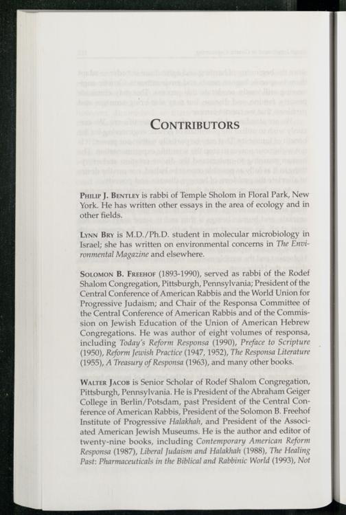 WALTER JacoB is Senior Scholar of Rodef Shalom Congregation, Pittsburgh , Pennsylvania . He is President of the Abraham Geiger College in Berlin/Potsdam , past President of the Central Conference of American Rabbis, President of the Solomon B. Freehof Institute of Progressive Halakhah, and President of the Associated American Jewish Museums. He is the author and editor of twenty-nine books, including Contemporary American Reform Responsa(1987), Liberal Judaism and Halakhah(1988), The Healing Past: Pharmaceuticals in the Biblical and Rabbinic World(1993), Not