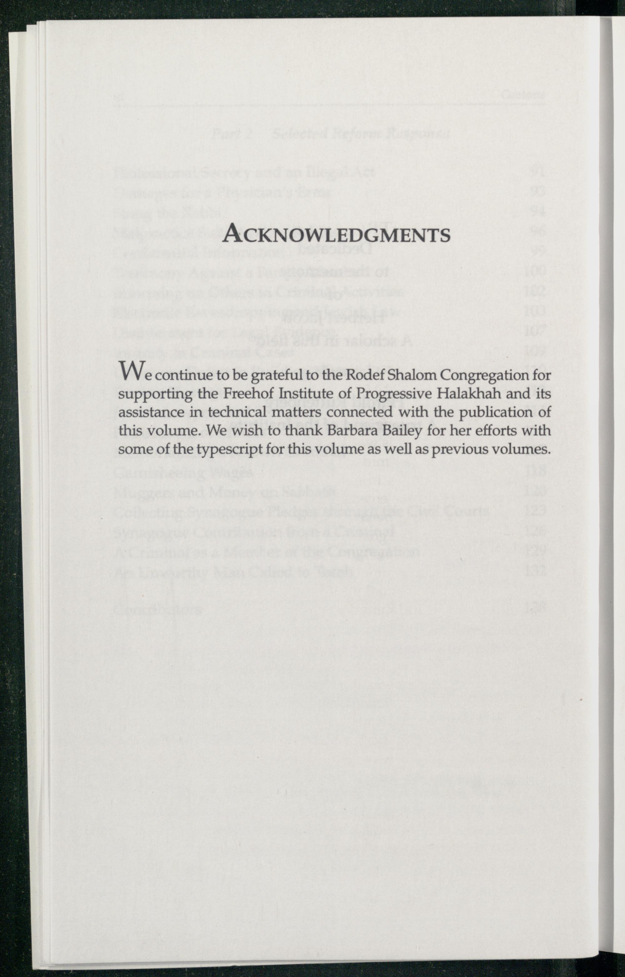 We continue to be grateful to the Rodef Shalom Congregation for supporting the Freehof Institute of Progressive Halakhah and its assistance in technical matters connected with the publication of this volume. We wish to thank Barbara Bailey for her efforts with some of the typescript for this volume as well as previous volumes.