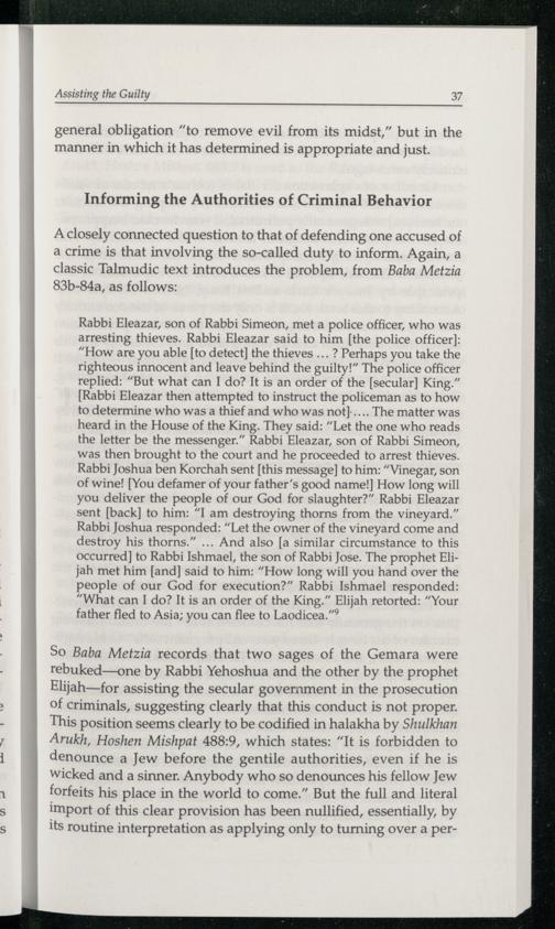 So Baba Metzia records that two sages of the Gemara were rebuked—one by Rabbi Yehoshua and the other by the prophet Elijah —for assisting the secular government in the prosecution of criminals, suggesting clearly that this conduct is not proper. This position seems clearly to be codified in halakha by Shulkhan Arukh, Hoshen Mishpat 488:9, which states:“It is forbidden to denounce a Jew before the gentile authorities, even if he is wicked and a sinner. Anybody who so denounces his fellow Jew forfeits his place in the world to come.” But the full and literal import of this clear provision has been nullified, essentially, by its routine interpretation as applying only to turning over a per
