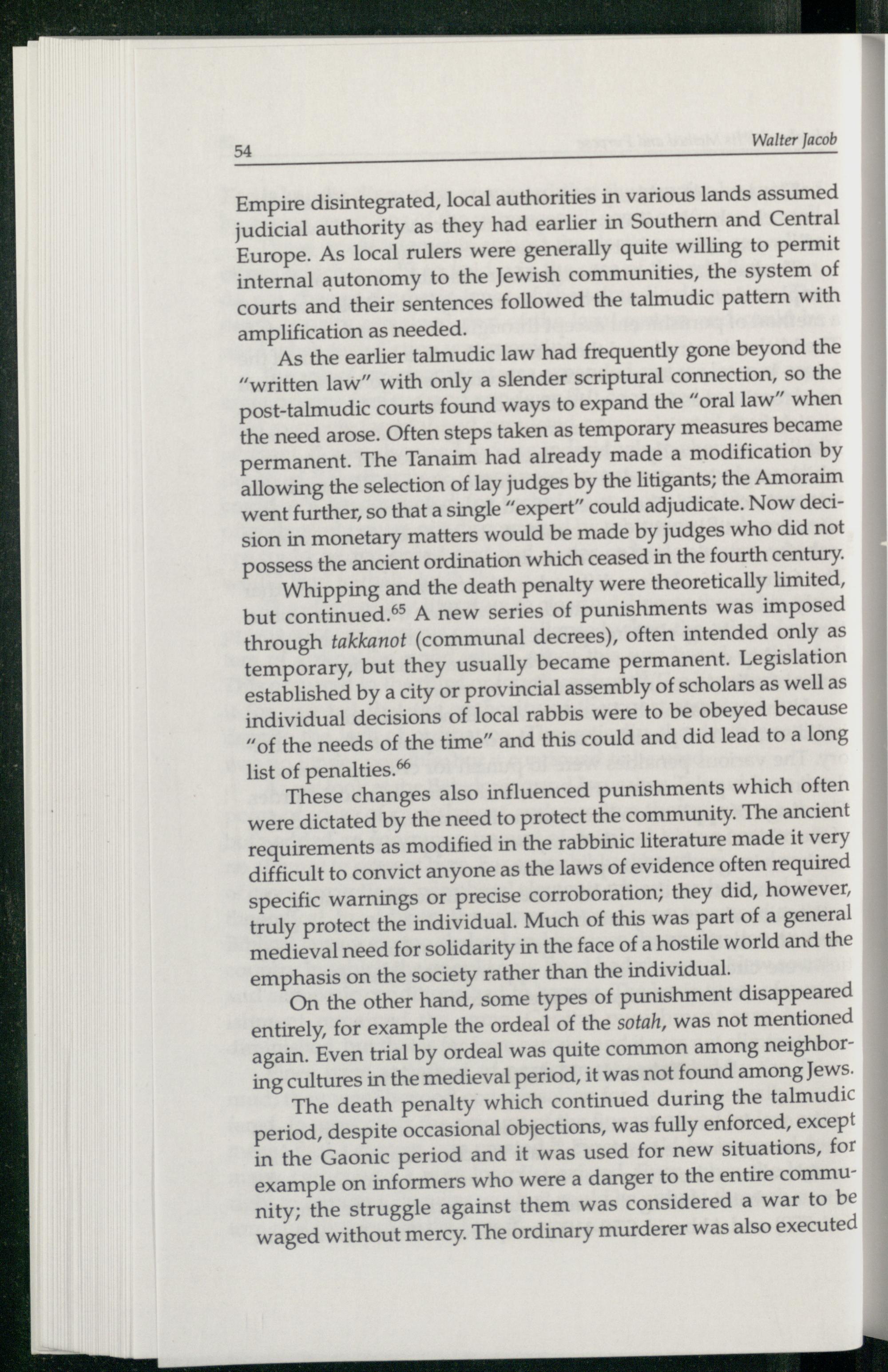 54 Walter Jacob Empire disintegrated, local authorities in various lands assumed judicial authority as they had earlier in Southern and Central Europe . As local rulers were generally quite willing to permit internal autonomy to the Jewish communities, the system of courts and their sentences followed the talmudic pattern with amplification as needed.