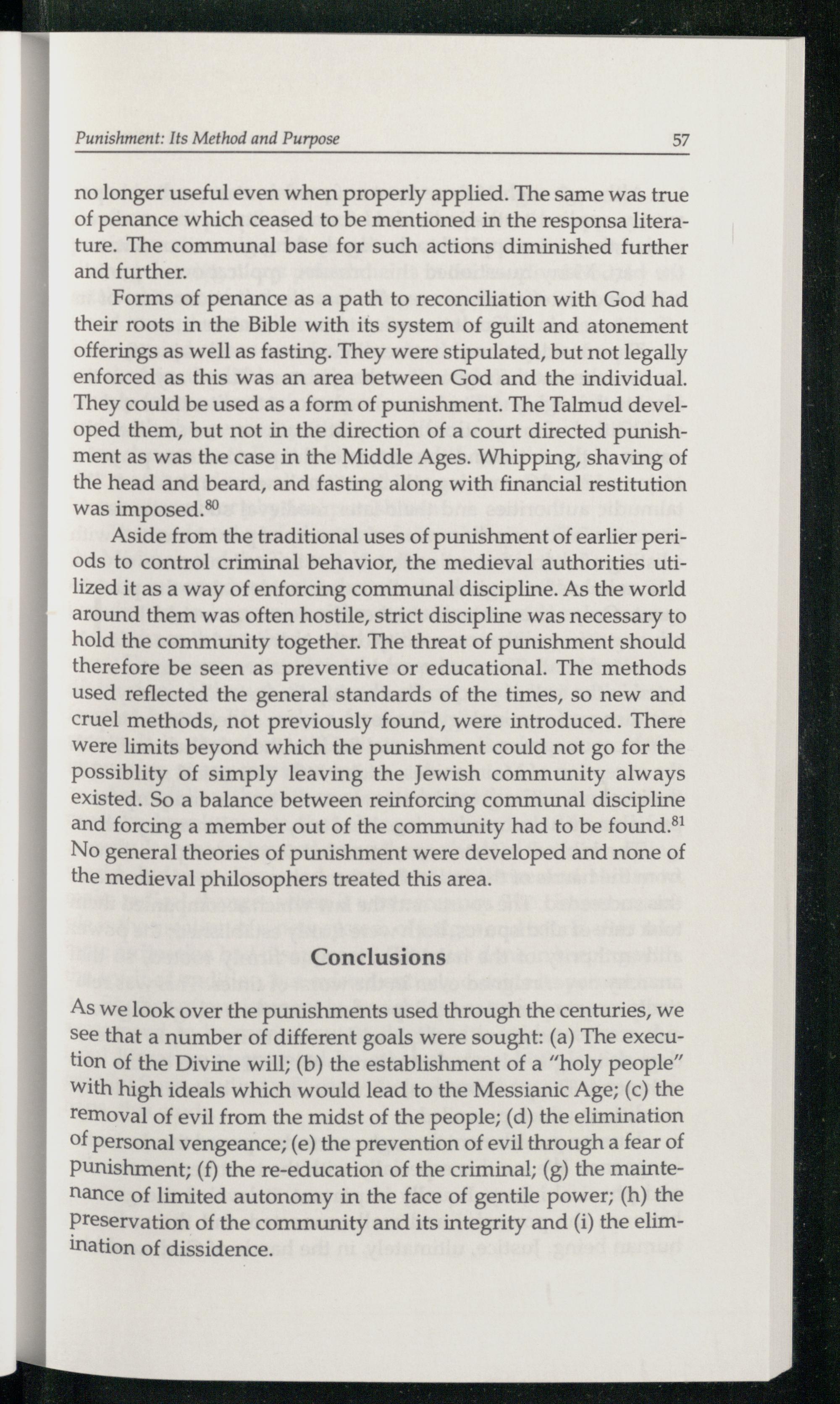As we look over the punishments used through the centuries, we see that a number of different goals were sought:(a) The execution of the Divine will;(b) the establishment of a“holy people” with high ideals which would lead to the Messianic Age;(c) the removal of evil from the midst of the people;(d) the elimination of personal vengeance;(e) the prevention of evil through a fear of Punishment;(f) the re-education of the criminal;(g) the mainteNance of limited autonomy in the face of gentile power;(h) the Preservation of the community and its integrity and(i) the elimination of dissidence.