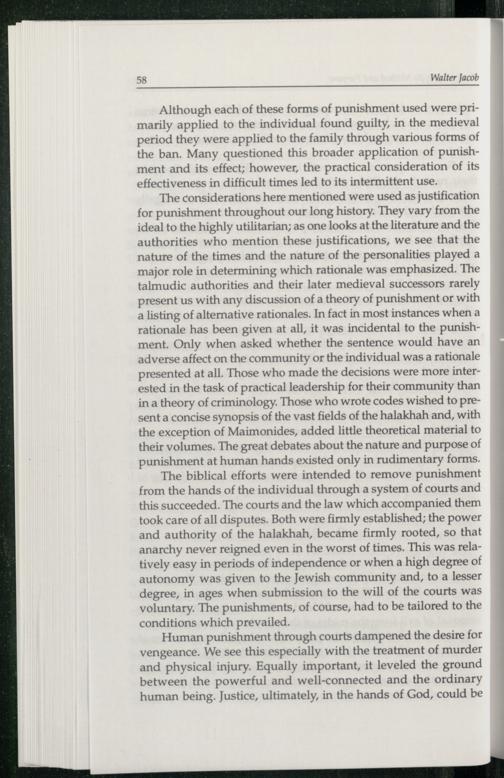 The considerations here mentioned were used as justification for punishment throughout our long history. They vary from the ideal to the highly utilitarian; as one looks at the literature and the authorities who mention these justifications, we see that the nature of the times and the nature of the personalities played a major role in determining which rationale was emphasized. The talmudic authorities and their later medieval successors rarely present us with any discussion of a theory of punishment or with a listing of alternative rationales. In fact in most instances when a rationale has been given at all, it was incidental to the punishment. Only when asked whether the sentence would have an adverse affect on the community or the individual was a rationale presented at all. Those who made the decisions were more interested in the task of practical leadership for their community than in a theory of criminology. Those who wrote codes wished to present a concise synopsis of the vast fields of the halakhah and, with the exception of Maimonides , added little theoretical material to their volumes. The great debates about the nature and purpose of punishment at human hands existed only in rudimentary forms.