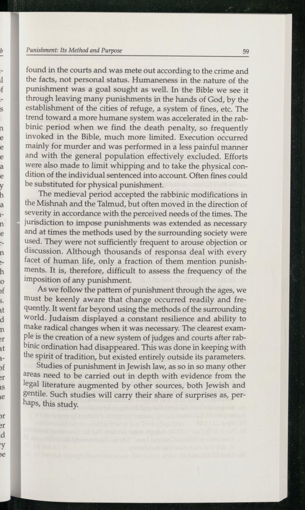 Studies of punishment in Jewish law, as so in so many other areas need to be carried out in depth with evidence from the legal literature augmented by other sources, both Jewish and gentile. Such studies will carry their share of surprises as, perhaps, this study.