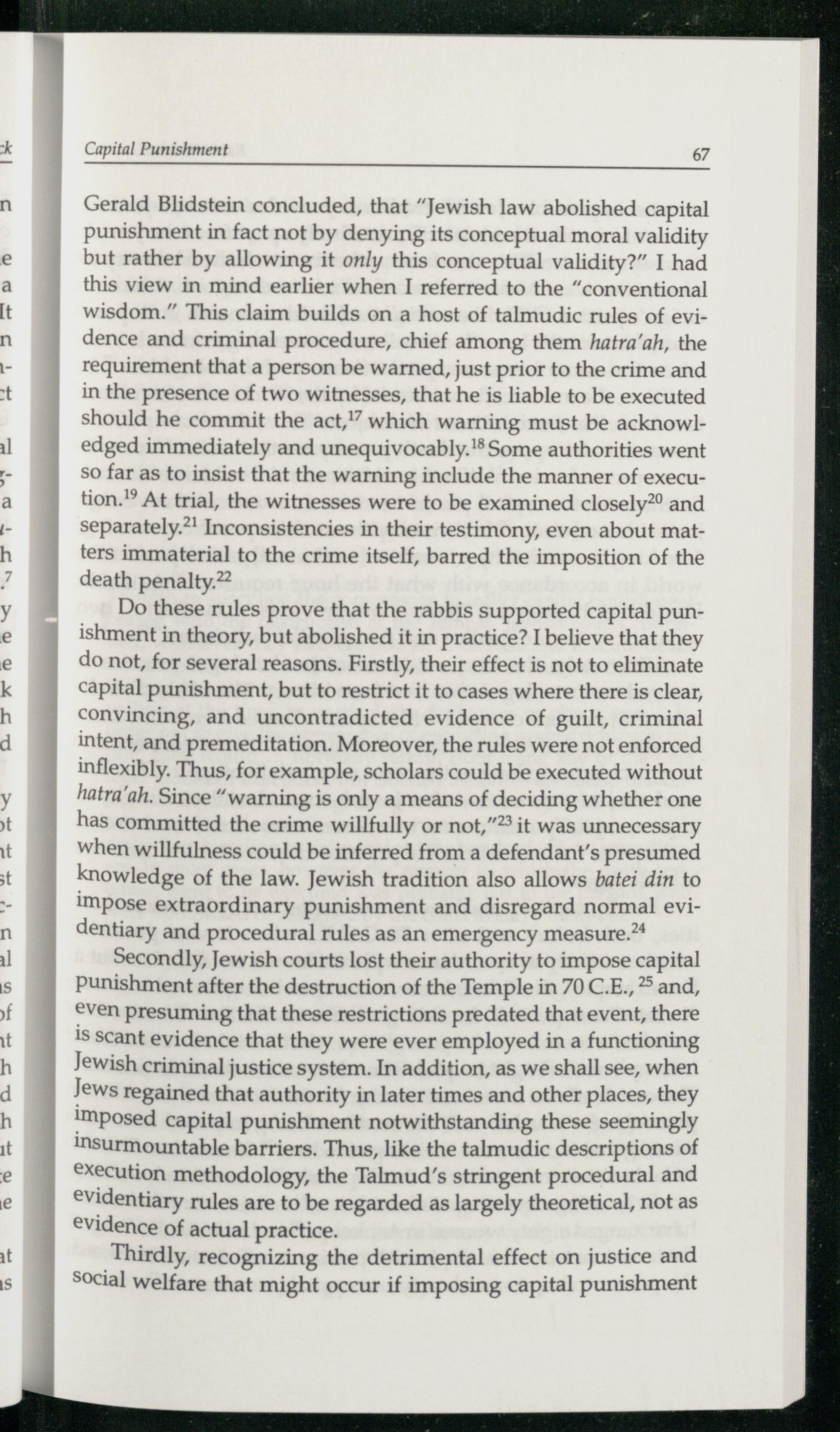 Gerald Blidstein concluded, that“Jewish law abolished capital punishment in fact not by denying its conceptual moral validity but rather by allowing it only this conceptual validity?” I had this view in mind earlier when I referred to the“conventional wisdom.” This claim builds on a host of talmudic rules of evidence and criminal procedure, chief among them hatra’ah, the requirement that a person be warned, just prior to the crime and in the presence of two witnesses, that he is liable to be executed should he commit the act,” which warning must be acknowledged immediately and unequivocably.'® Some authorities went so far as to insist that the warning include the manner of execution." At trial, the witnesses were to be examined closely? and separately.?! Inconsistencies in their testimony, even about matters immaterial to the crime itself, barred the imposition of the death penalty.?2
