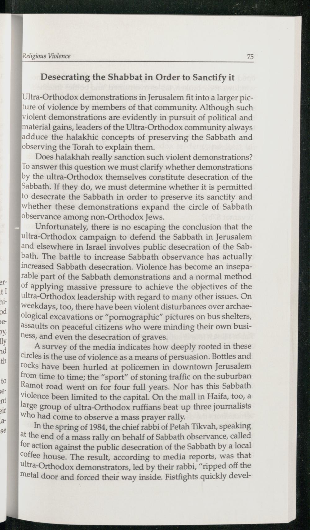 Unfortunately, there is no escaping the conclusion that the ultra-Orthodox campaign to defend the Sabbath in Jerusalem and elsewhere in Israel involves public desecration of the Sab bath . The battle to increase Sabbath observance has actually increased Sabbath desecration. Violence has become an inseparable part of the Sabbath demonstrations and a normal method of applying massive pressure to achieve the objectives of the ultra-Orthodox leadership with regard to many other issues. On | weekdays, too, there have been violent disturbances over archaeological excavations or“pornographic” pictures on bus shelters, | assaults on peaceful citizens who were minding their own busi|1ess, and even the desecration of graves.
