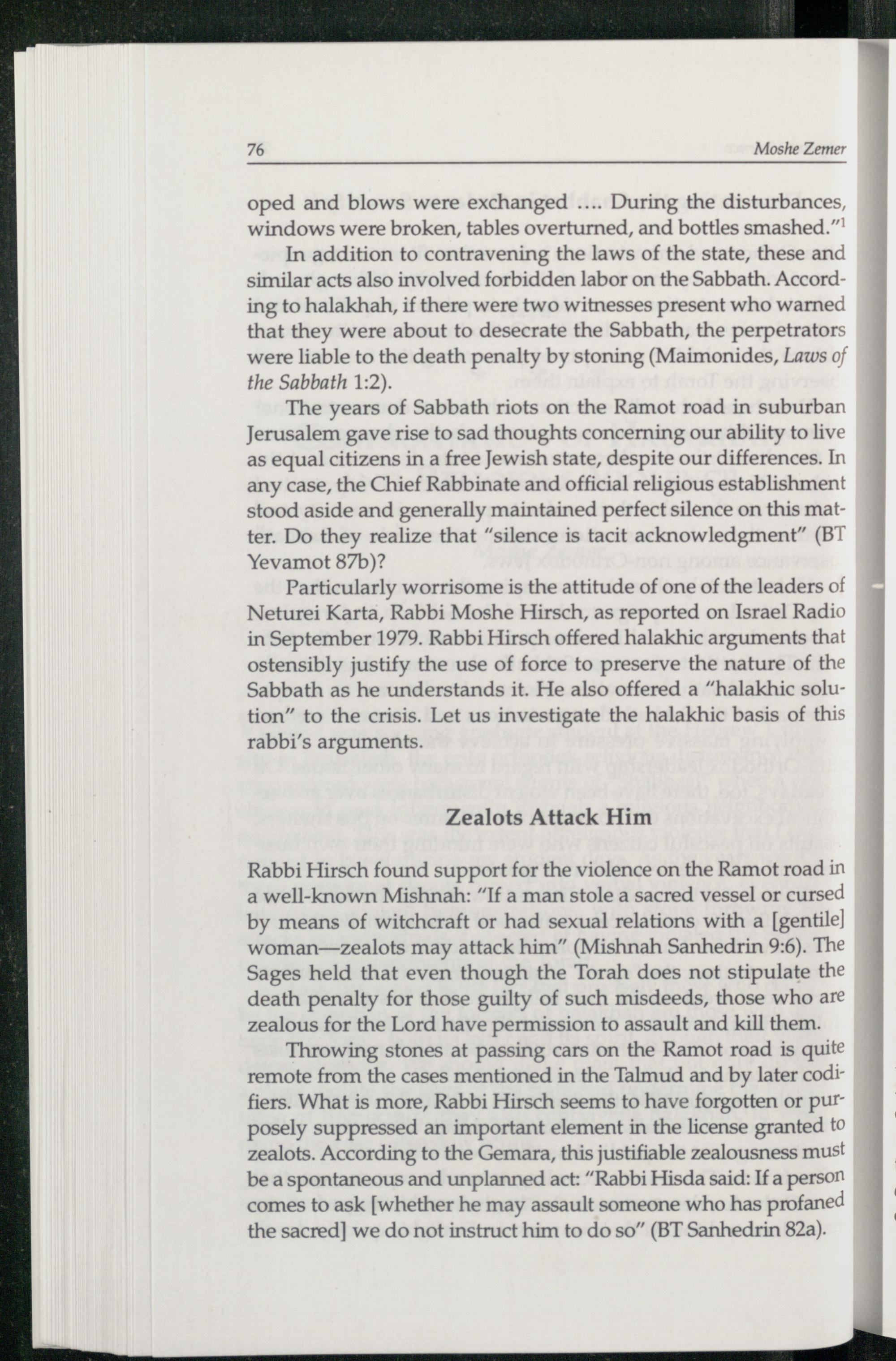 Rabbi Hirsch found support for the violence on the Ramot road in a well-known Mishnah :“If a man stole a sacred vessel or cursed by means of witchcraft or had sexual relations with a[gentile] woman—zealots may attack him”(Mishnah Sanhedrin 9:6). The Sages held that even though the Torah does not stipulate the death penalty for those guilty of such misdeeds, those who are zealous for the Lord have permission to assault and kill them. Throwing stones at passing cars on the Ramot road is quite remote from the cases mentioned in the Talmud and by later codifiers. What is more, Rabbi Hirsch seems to have forgotten or purposely suppressed an important element in the license granted to zealots. According to the Gemara, this justifiable zealousness must be a spontaneous and unplanned act:“Rabbi Hisda said: If a person comes to ask[whether he may assault someone who has profaned the sacred] we do not instruct him to do so”(BT Sanhedrin 82a).