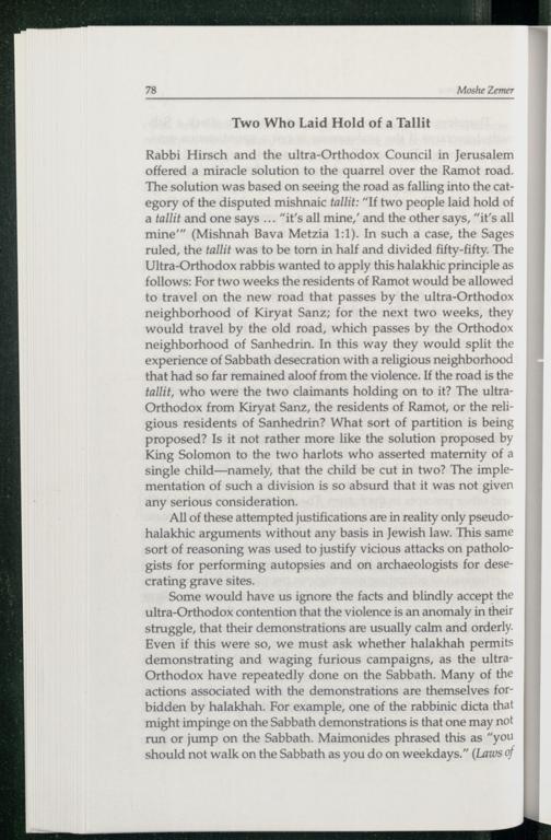 Rabbi Hirsch and the ultra-Orthodox Council in Jerusalem offered a miracle solution to the quarrel over the Ramot road. The solution was based on seeing the road as falling into the category of the disputed mishnaic tallit:“If two people laid hold of a tallit and one says...“it’s all mine,” and the other says,“it’s all mine’”(Mishnah Bava Metzia 1:1). In such a case, the Sages ruled, the tallit was to be torn in half and divided fifty-fifty. The Ultra-Orthodox rabbis wanted to apply this halakhic principle as follows: For two weeks the residents of Ramot would be allowed to travel on the new road that passes by the ultra-Orthodox neighborhood of Kiryat Sanz; for the next two weeks, they would travel by the old road, which passes by the Orthodox neighborhood of Sanhedrin. In this way they would split the experience of Sabbath desecration with a religious neighborhood that had so far remained aloof from the violence. If the road is the tallit, who were the two claimants holding on to it? The ultra Orthodox from Kiryat Sanz, the residents of Ramot, or the religious residents of Sanhedrin? What sort of partition is being proposed? Is it not rather more like the solution proposed by King Solomon to the two harlots who asserted maternity of a single child—namely, that the child be cut in two? The implementation of such a division is so absurd that it was not given any serious consideration.