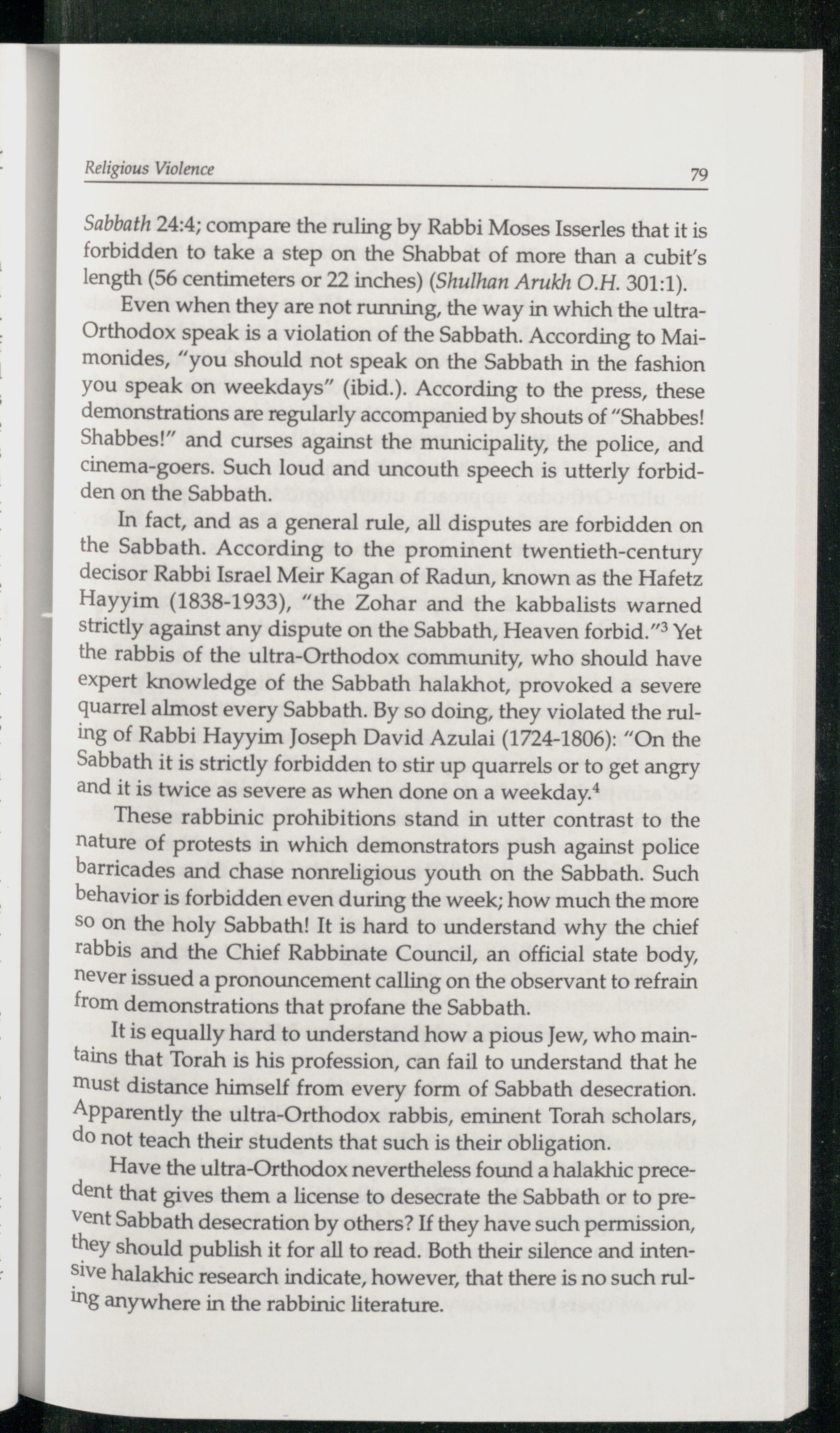 Even when they are not running, the way in which the ultra Orthodox speak is a violation of the Sabbath . According to Mai monides ,“you should not speak on the Sabbath in the fashion you speak on weekdays”(ibid.). According to the press, these demonstrations are regularly accompanied by shouts of“Shabbes ! Shabbes!” and curses against the municipality, the police, and cinema-goers. Such loud and uncouth speech is utterly forbidden on the Sabbath .