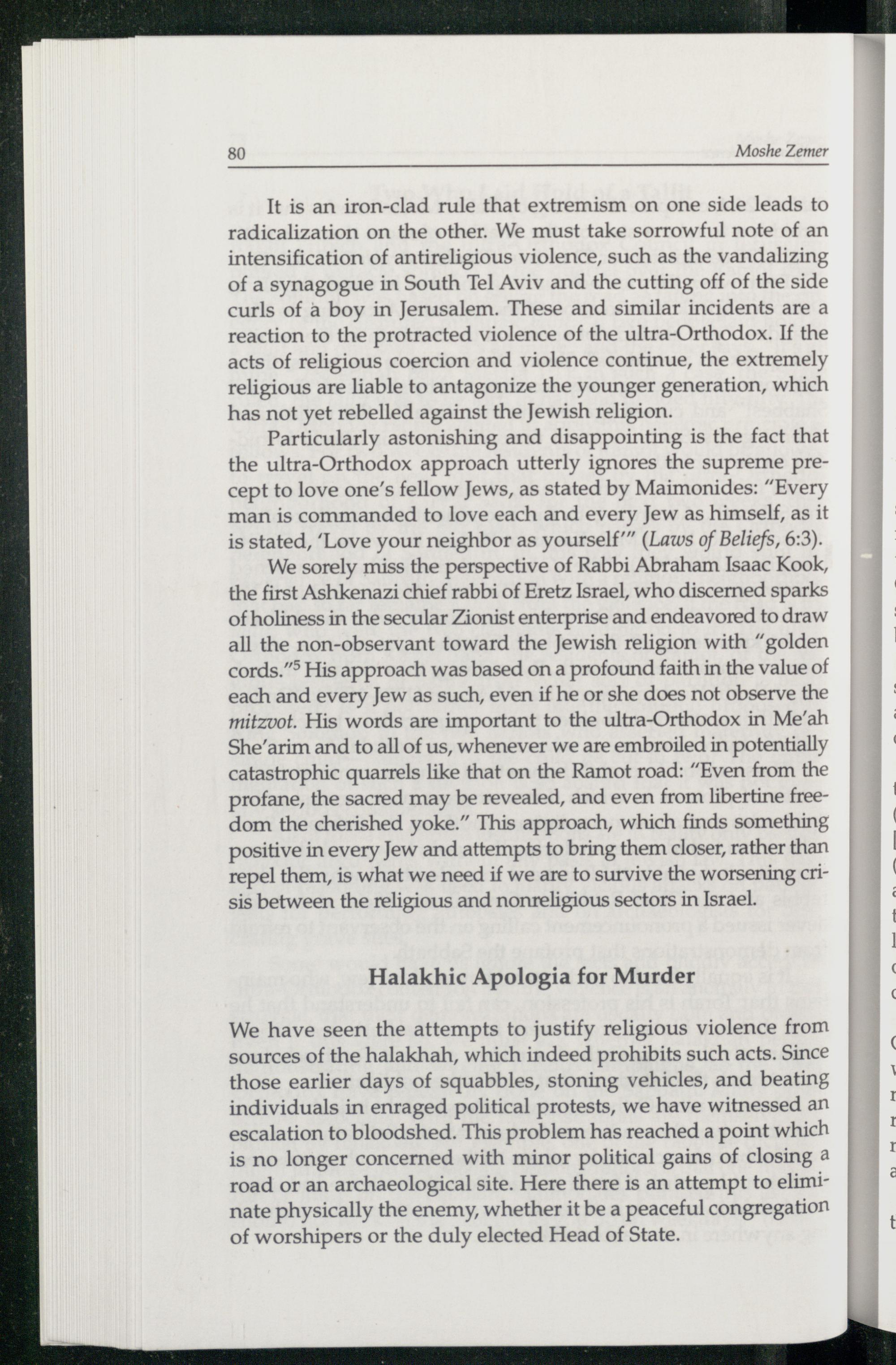 We have seen the attempts to justify religious violence from sources of the halakhah, which indeed prohibits such acts. Since those earlier days of squabbles, stoning vehicles, and beating individuals in enraged political protests, we have witnessed an escalation to bloodshed. This problem has reached a point which is no longer concerned with minor political gains of closing a road or an archaeological site. Here there is an attempt to eliminate physically the enemy, whether it be a peaceful congregation of worshipers or the duly elected Head of State.