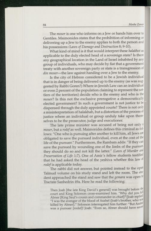 The late prime minister was accused of being not only moser, but a rodef as well. Maimonides defines this criminal as for lows:“One who is pursuing after another to kill him, all Jews are| obligated to save the pursued individual, even at the cost of the| life of the pursuer.” Furthermore, the Rambam adds:“If they can} save the pursued by wounding one of the limbs of the pursue!| they should do so and not kill the latter.”(Laws of Murder ani| Preservation of Life 1:7). One of Amir’s fellow students testified that he had asked the head of the yeshiva whether this law 0'| rodef is applicable today.