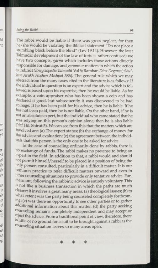 In the case of counseling ordinarily done by rabbis, there is No exchange of funds. The rabbi makes no pretense to being an expert in the field. In addition to that, a rabbi would and should not permit himself/herself to be placed in a position of being the only person consulted, particularly in a difficult matter. It is our common practice to refer difficult matters onward and even in other counseling situations to provide only tentative advice. Furthermore, following the rabbinic advice is entirely voluntary. This is not like a business transaction in which the paths are much clearer; it involves a great many areas:(a) theological issues;(b) to What extent was the party being counseled completely forthcomNg;(c) was there an opportunity to see other parties or to gather additional information about this matter,(d) the party seeking counseling remains completely independent and may accept or Ieject the advice. From a traditional point of view, therefore, there is little or no ground for a suit to be brought against a rabbi as the COunseling situation leaves so many areas open.