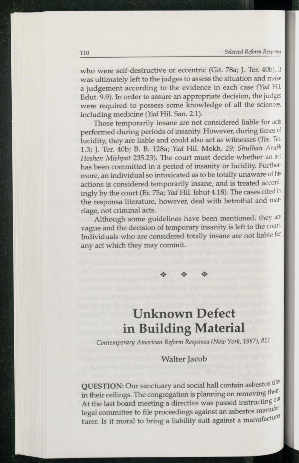 Those temporarily insane are not considered liable for acts performed during periods of insanity. However, during times of lucidity, they are liable and could also act as witnesses(Tos. Tet 1.3; J. Ter. 40b; B. B. 128a; Yad Hil. Mekh. 29; Shulhan Arukh Hoshen Mishpat 235.23). The court must decide whether an act has been committed in a period of insanity or lucidity. Further more, an individual so intoxicated as to be totally unaware of his actions is considered temporarily insane, and is treated accord: ingly by the court(Er. 75a; Yad Hil. Ishut 4.18). The cases cited in the responsa literature, however, deal with betrothal and mar riage, not criminal acts.