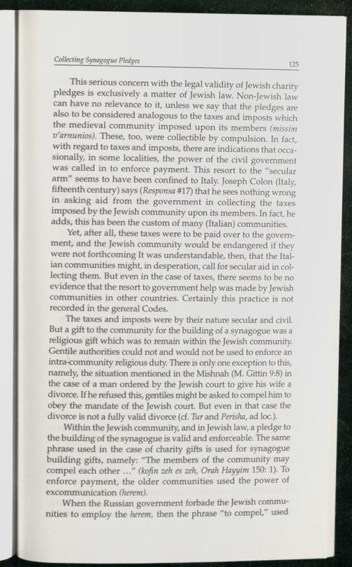 The taxes and imposts were by their nature secular and civil. But a gift to the community for the building of a synagogue was a religious gift which was to remain within the Jewish community. Gentile authorities could not and would not be used to enforce an intra-community religious duty. There is only one exception to this, namely, the situation mentioned in the Mishnah (M. Gittin 9:8) in the case of a man ordered by the Jewish court to give his wife a divorce. If he refused this, gentiles might be asked to compel him to obey the mandate of the Jewish court. But even in that case the divorce is not a fully valid divorce(cf. Tur and Perisha, ad loc.).