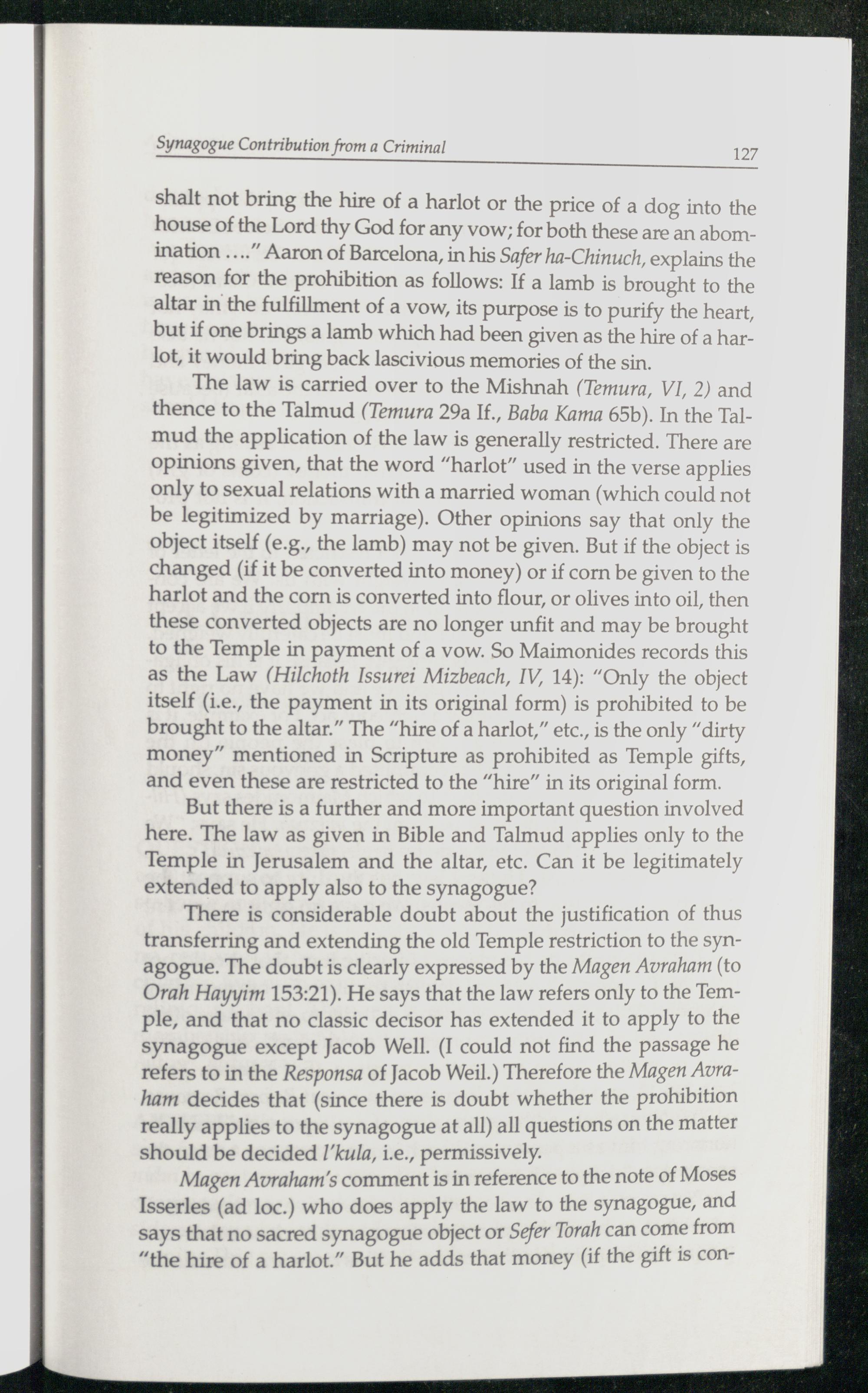 The law is carried over to the Mishnah(Temura, VI, 2) and thence to the Talmud (Temura 29a If., Baba Kama 65b). In the Tal mud the application of the law is generally restricted. There are opinions given, that the word“harlot” used in the verse applies only to sexual relations with a married woman(which could not be legitimized by marriage). Other opinions say that only the object itself(e.g., the lamb) may not be given. But if the object is changed(if it be converted into money) or if corn be given to the harlot and the corn is converted into flour, or olives into oil, then these converted objects are no longer unfit and may be brought to the Temple in payment of a vow. So Maimonides records this as the Law(Hilchoth Issurei Mizbeach, IV, 14):“Only the object itself(i.e., the payment in its original form) is prohibited to be brought to the altar.” The“hire of a harlot,” etc., is the only“dirty money” mentioned in Scripture as prohibited as Temple gifts, and even these are restricted to the“hire” in its original form.
