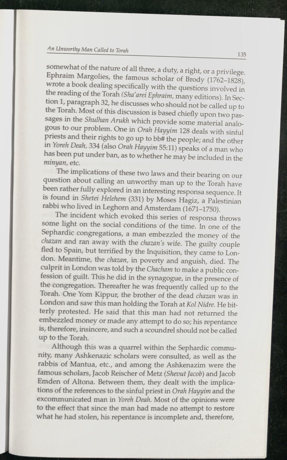 somewhat of the nature of all three, a duty, aright, or a privilege. Ephraim Margolies, the famous scholar of Brody(1762-1828), wrote a book dealing specifically with the questions involved in the reading of the Torah (Sha’arei Ephraim, many editions). In Section 1, paragraph 32, he discusses who should not be called up to the Torah . Most of this discussion is based chiefly upon two passages in the Shulhan Arukh which provide some material analogous to our problem. One in Orah Hayyim 128 deals with sinful priests and their rights to go up to bb# the people; and the other in Yoreh Deah, 334(also Orah Hayyim 55:11) speaks of a man who has been put under ban, as to whether he may be included in the minyan, etc.
