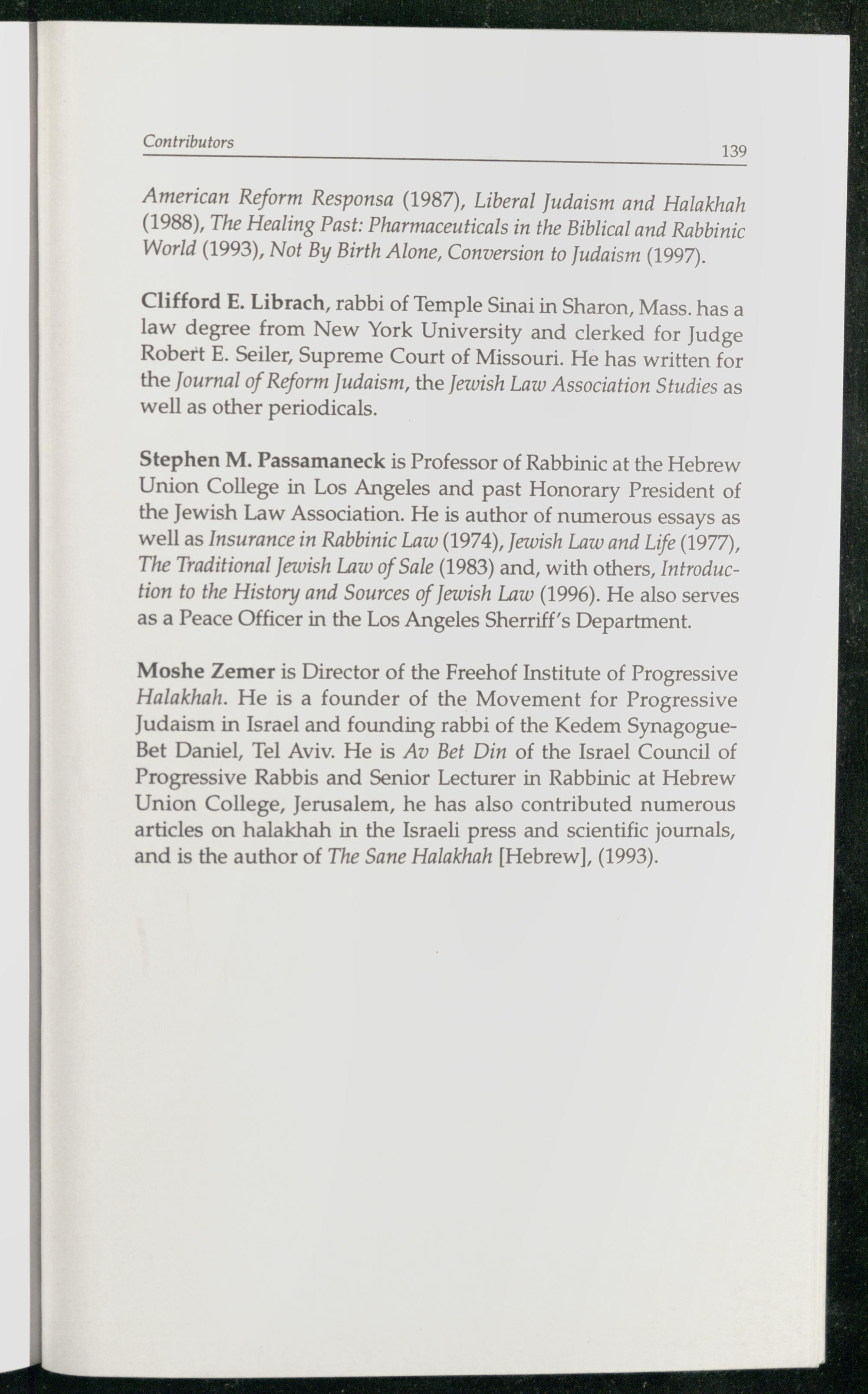 Clifford E. Librach, rabbi of Temple Sinai in Sharon, Mass. has a law degree from New York University and clerked for Judge Robert E. Seiler, Supreme Court of Missouri. He has written for the Journal of Reform Judaism, the Jewish Law Association Studies as well as other periodicals.