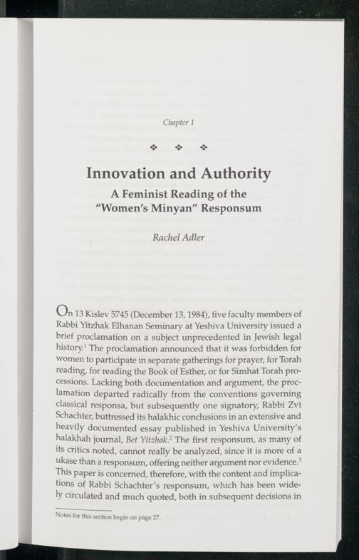 On 13 Kislev 5745(December 13, 1984), five faculty members of Rabbi Yitzhak Elhanan Seminary at Yeshiva University issued a brief proclamation on a subject unprecedented in Jewish legal history.! The proclamation announced that it was forbidden for women to participate in separate gatherings for prayer, for Torah reading, for reading the Book of Esther, or for Simhat Torah processions. Lacking both documentation and argument, the proclamation departed radically from the conventions governing classical responsa, but subsequently one signatory, Rabbi Zvi Schachter, buttressed its halakhic conclusions in an extensive and heavily documented essay published in Yeshiva University ’s halakhah journal, Bet Yitzhak? The first responsum, as many of its critics noted, cannot really be analyzed, since it is more of a ukase than a responsum, offering neither argument nor evidence.’ This paper is concerned, therefore, with the content and implications of Rabbi Schachter’s responsum, which has been widely circulated and much quoted, both in subsequent decisions in