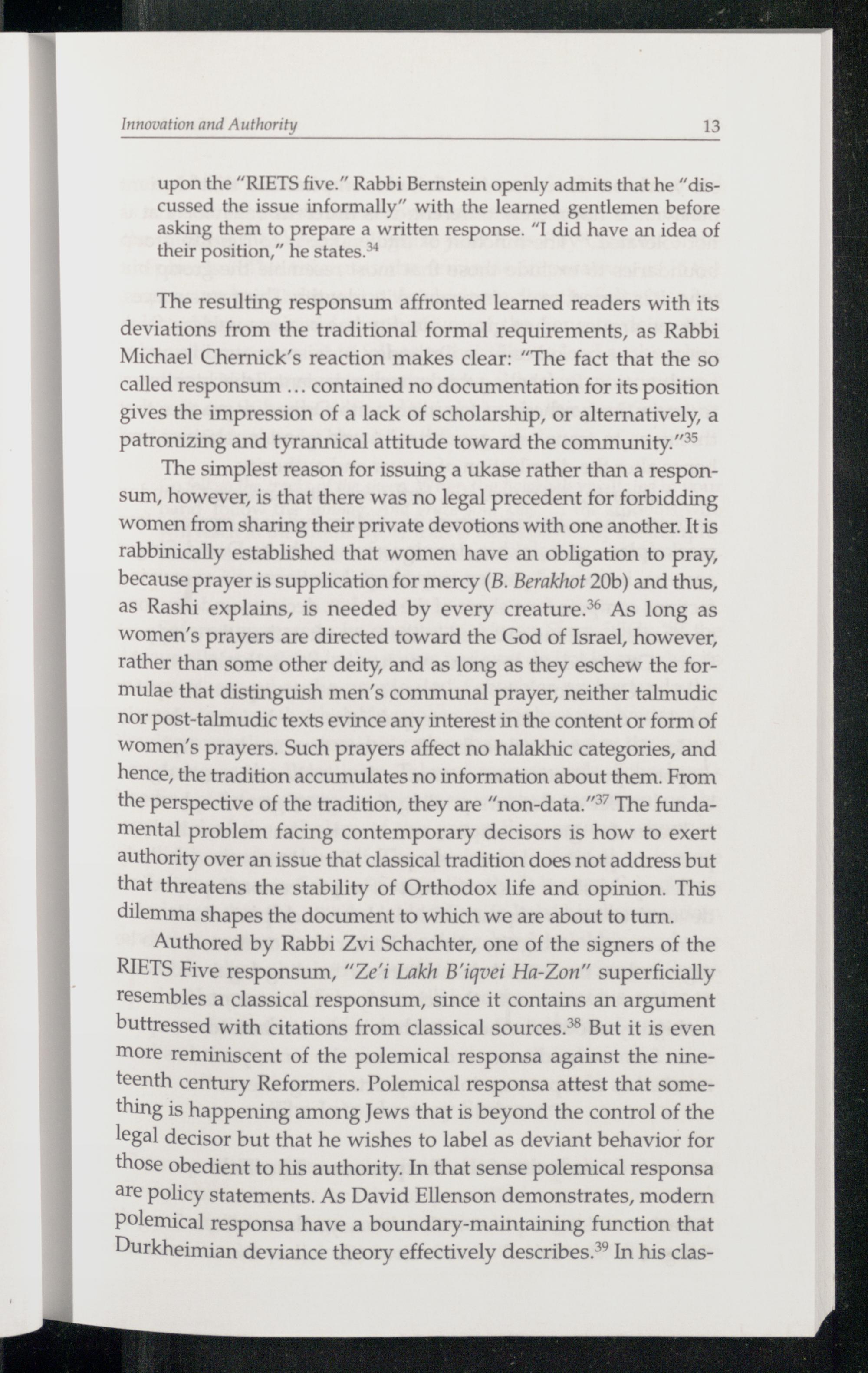 as Rashi explains, is needed by every creature. women’s prayers are directed toward the God of Israel, however, rather than some other deity, and as long as they eschew the formulae that distinguish men’s communal prayer, neither talmudic nor post-talmudic texts evince any interest in the content or form of women’s prayers. Such prayers affect no halakhic categories, and hence, the tradition accumulates no information about them. From the perspective of the tradition, they are“non-data.”*” The fundamental problem facing contemporary decisors is how to exert authority over an issue that classical tradition does not address but that threatens the stability of Orthodox life and opinion. This dilemma shapes the document to which we are about to turn. Authored by Rabbi Zvi Schachter, one of the signers of the RIETS Five responsum,“Ze'i Lakh B'iquei Ha-Zon" superficially resembles a classical responsum, since it contains an argument buttressed with citations from classical sources. But it is even more reminiscent of the polemical responsa against the nineteenth century Reformers. Polemical responsa attest that something is happening among Jews that is beyond the control of the legal decisor but that he wishes to label as deviant behavior for those obedient to his authority. In that sense polemical responsa are policy statements. As David Ellenson demonstrates, modern polemical responsa have a boundary-maintaining function that Durkheimian deviance theory effectively describes.® In his clas