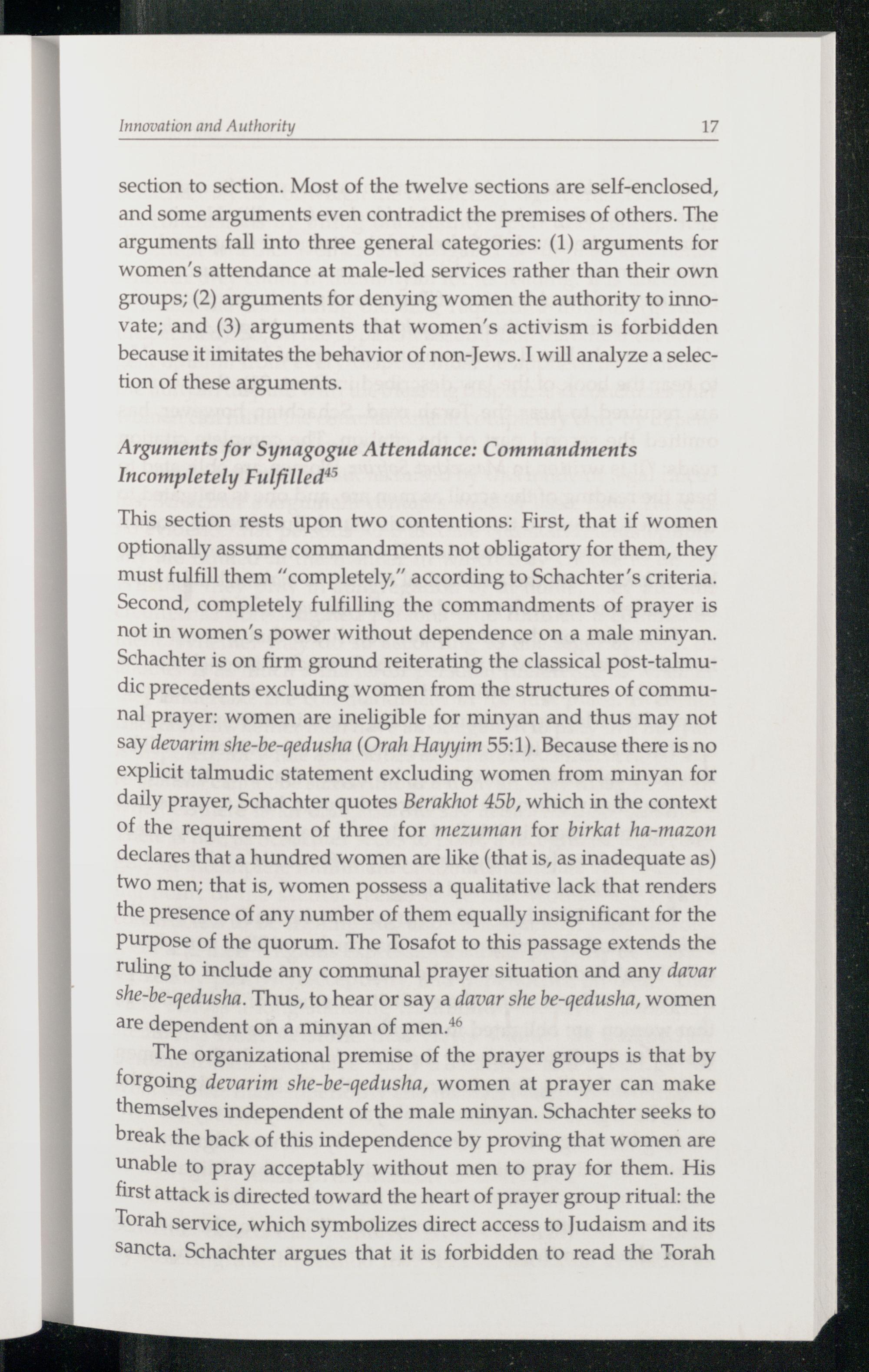 section to section. Most of the twelve sections are self-enclosed, and some arguments even contradict the premises of others. The arguments fall into three general categories:(1) arguments for women’s attendance at male-led services rather than their own groups;(2) arguments for denying women the authority to innovate; and(3) arguments that women’s activism is forbidden because it imitates the behavior of non-Jews . I will analyze a selection of these arguments.