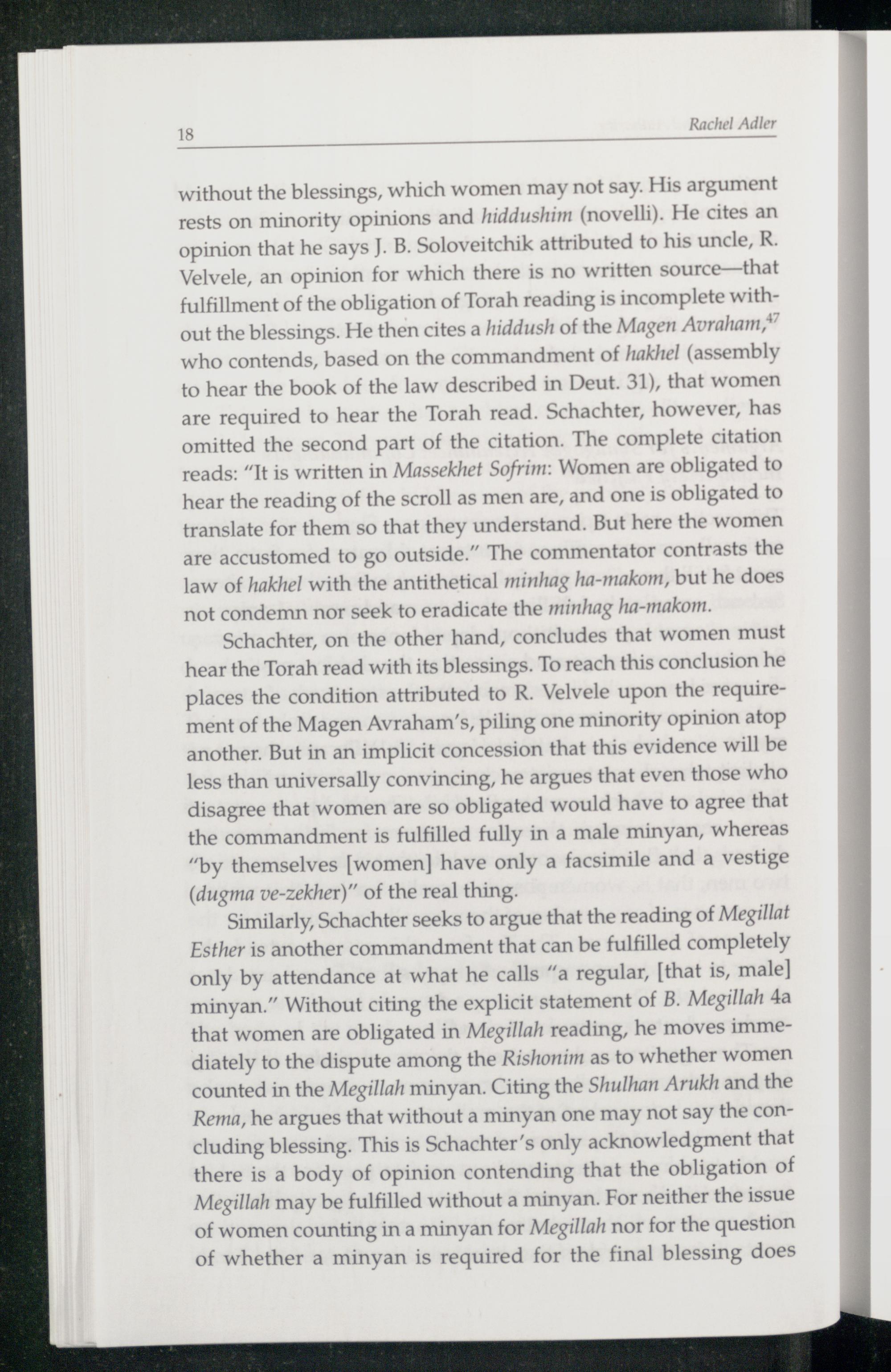 Similarly, Schachter seeks to argue that the reading of Megillat Esther is another commandment that can be fulfilled completely only by attendance at what he calls“a regular,[that is, male] minyan.” Without citing the explicit statement of B. Megillah 4a that women are obligated in Megillah reading, he moves immediately to the dispute among the Rishonim as to whether women counted in the Megillah minyan. Citing the Shulhan Arukh and the Rema, he argues that without a minyan one may not say the concluding blessing. This is Schachter’s only acknowledgment that there is a body of opinion contending that the obligation of Megillah may be fulfilled without a minyan. For neither the issue of women counting in a minyan for Megillah nor for the question of whether a minyan is required for the final blessing does