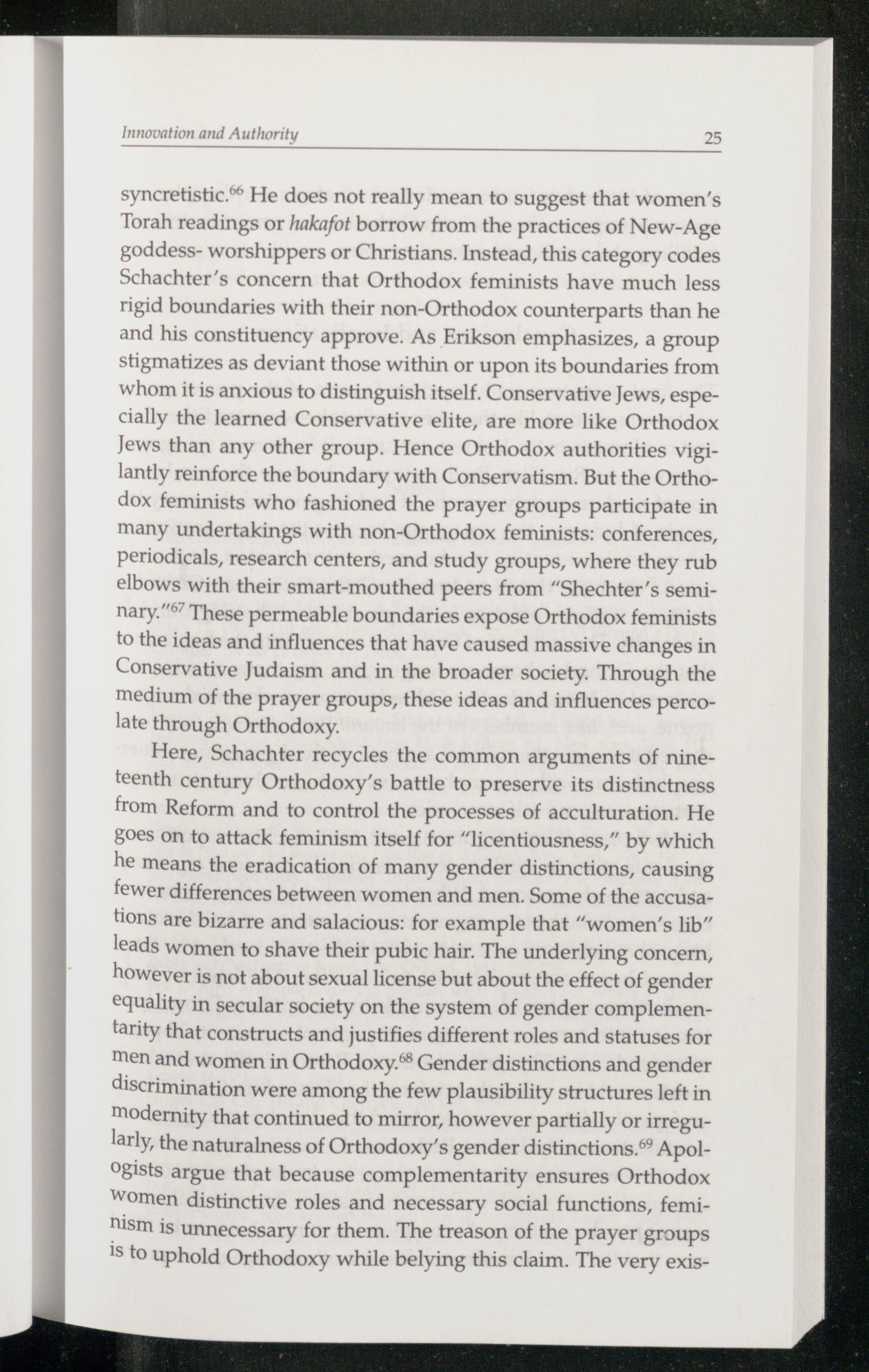 syncretistic. He does not really mean to suggest that women’s Torah readings or hakafot borrow from the practices of New-Age goddess- worshippers or Christians. Instead, this category codes Schachter ’s concern that Orthodox feminists have much less rigid boundaries with their non-Orthodox counterparts than he and his constituency approve. As Erikson emphasizes, a group stigmatizes as deviant those within or upon its boundaries from whom it is anxious to distinguish itself. Conservative Jews , especially the learned Conservative elite, are more like Orthodox Jews than any other group. Hence Orthodox authorities vigilantly reinforce the boundary with Conservatism . But the Ortho dox feminists who fashioned the prayer groups participate in many undertakings with non-Orthodox feminists: conferences, periodicals, research centers, and study groups, where they rub elbows with their smart-mouthed peers from“Shechter’s seminary.” These permeable boundaries expose Orthodox feminists to the ideas and influences that have caused massive changes in Conservative Judaism and in the broader society. Through the medium of the prayer groups, these ideas and influences percolate through Orthodoxy.