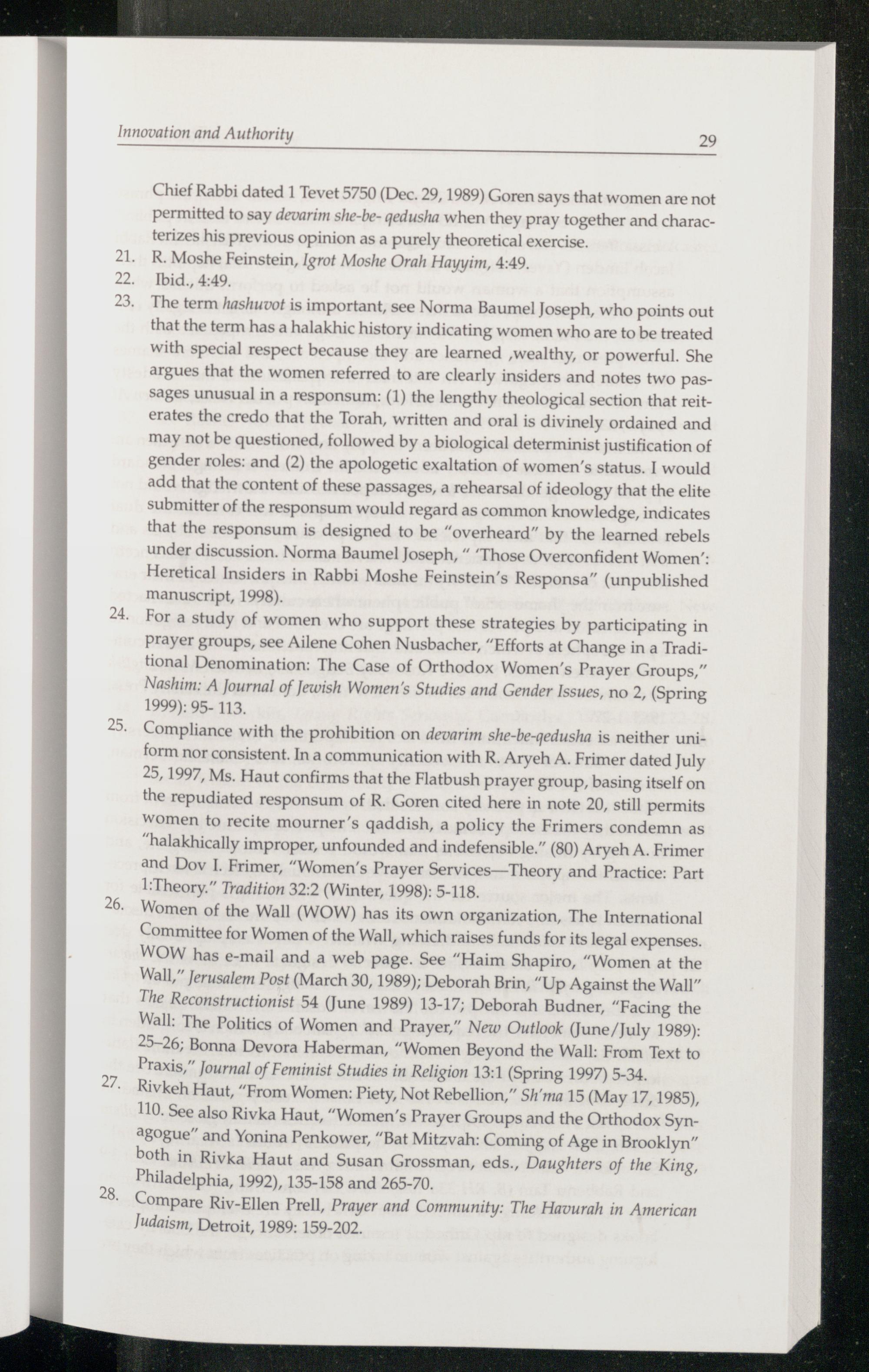 24. For a study of women who support these strategies by participating in prayer groups, see Ailene Cohen Nusbacher,“Efforts at Change in a Traditional Denomination: The Case of Orthodox Women’s Prayer Groups,” Nashim: A Journal of Jewish Women's Studies and Gender Issues, no 2,(Spring 1999): 95- 113.