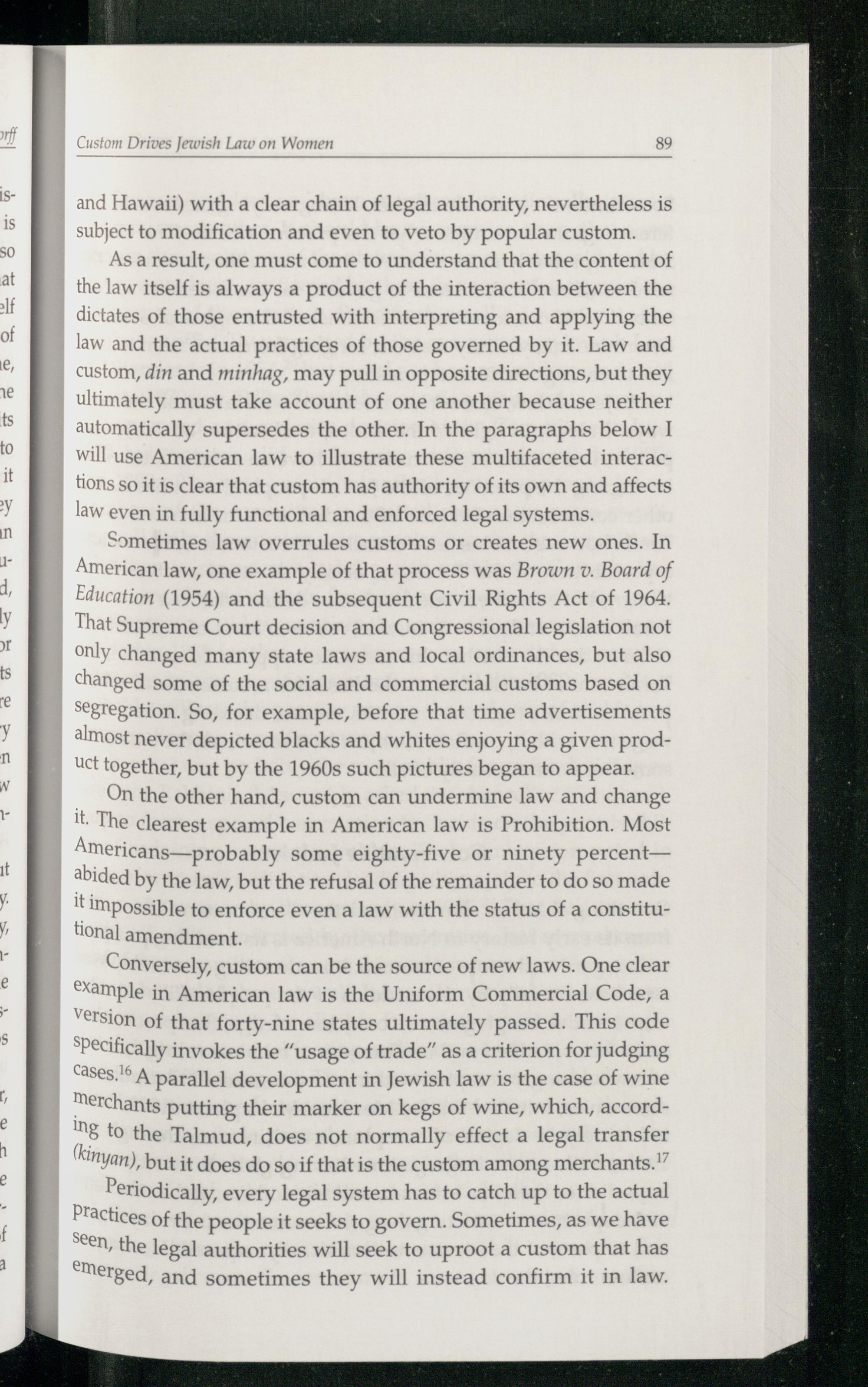 Conversely, custom can be the source of new laws. One clear ®ample in American law is the Uniform Commercial Code , a Version of that forty-nine states ultimately passed. This code Specifically invokes the“usage of trade” as a criterion for judging cases.' A parallel development in Jewish law is the case of wine Merchants putting their marker on kegs of wine, which, according to the Talmud , does not normally effect a legal transfer inyan), but it does do so if that is the custom among merchants.!”