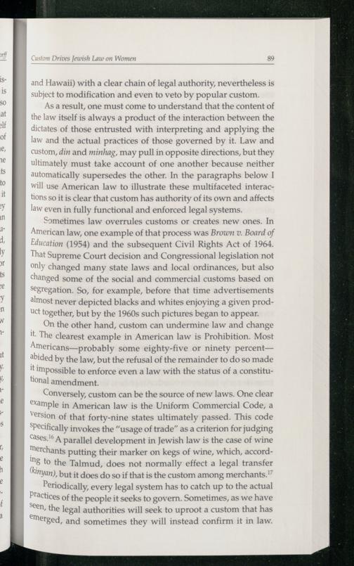 As a result, one must come to understand that the content of the law itself is always a product of the interaction between the dictates of those entrusted with interpreting and applying the law and the actual practices of those governed by it. Law and custom, din and minhag, may pull in opposite directions, but they ultimately must take account of one another because neither automatically supersedes the other. In the paragraphs below I will use American law to illustrate these multifaceted interactions so it is clear that custom has authority of its own and affects law even in fully functional and enforced legal systems.