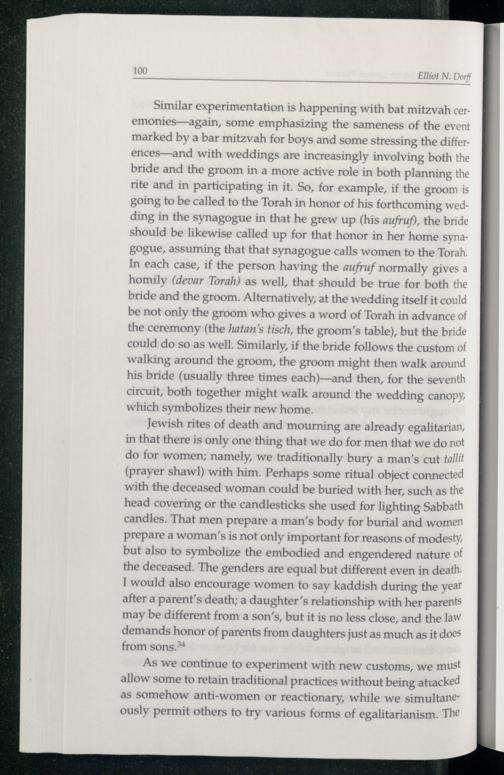 Similar experimentation is happening with bat mitzvah ceremonies—again, some emphasizing the sameness of the event marked by a bar mitzvah for boys and some stressing the differences—and with weddings are increasingly involving both the bride and the groom in a more active role in both planning the rite and in participating in it. So, for example, if the groom is going to be called to the Torah in honor of his forthcoming wedding in the synagogue in that he grew up(his aufruf), the bride should be likewise called up for that honor in her home synagogue, assuming that that synagogue calls women to the Torah . In each case, if the person having the aufruf normally gives a homily(devar Torah ) as well, that should be true for both the bride and the groom. Alternatively, at the wedding itself it could be not only the groom who gives a word of Torah in advance of the ceremony(the hatan'’s tisch, the groom's table), but the bride could do so as well. Similarly, if the bride follows the custom of walking around the groom, the groom might then walk around his bride(usually three times each)—and then, for the seventh circuit, both together might walk around the wedding canopy, which symbolizes their new home.