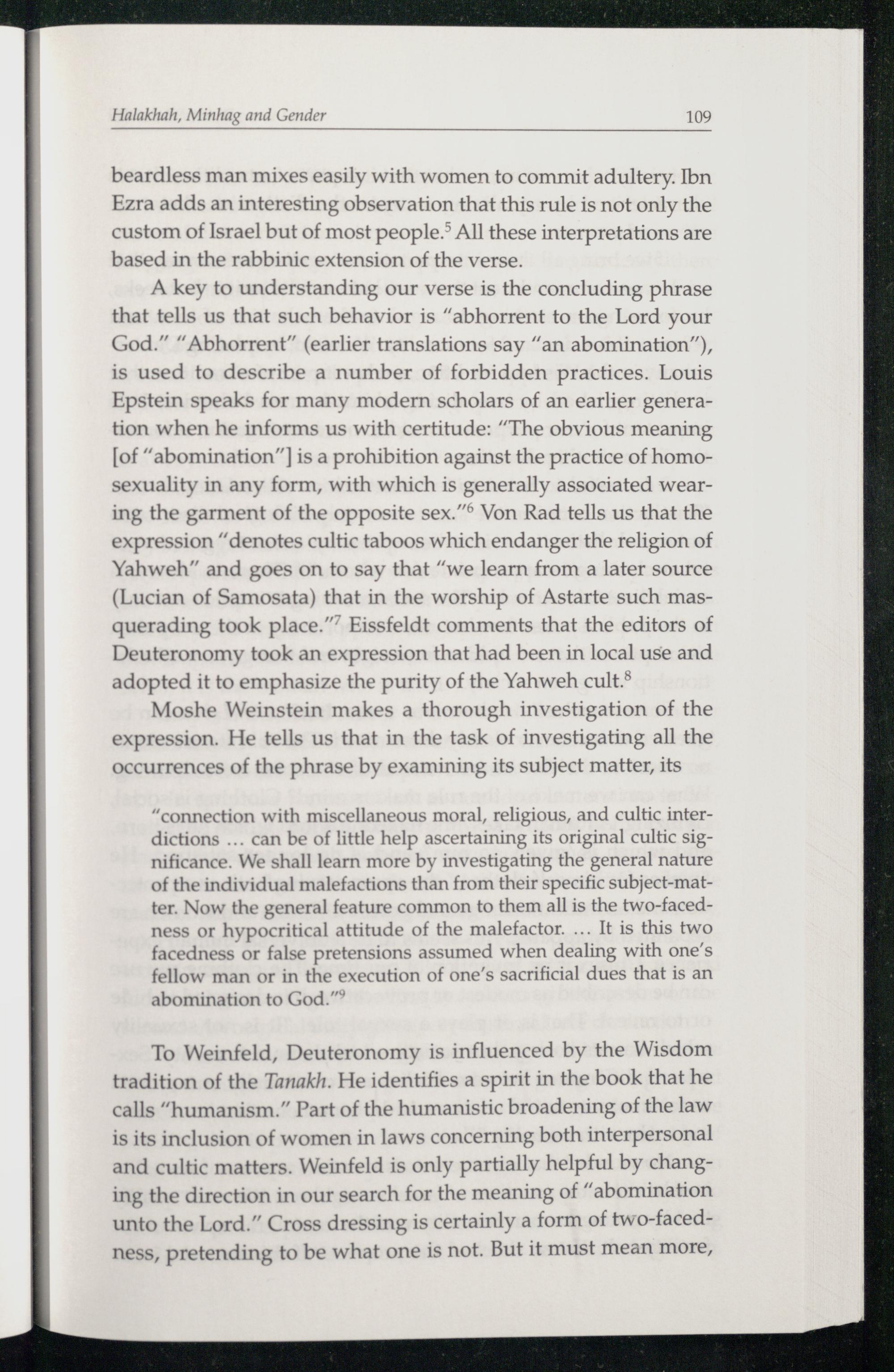 To Weinfeld, Deuteronomy is influenced by the Wisdom tradition of the Tanakh. He identifies a spirit in the book that he calls“humanism.” Part of the humanistic broadening of the law is its inclusion of women in laws concerning both interpersonal and cultic matters. Weinfeld is only partially helpful by changing the direction in our search for the meaning of“abomination unto the Lord.” Cross dressing is certainly a form of two-facedness, pretending to be what one is not. But it must mean more,