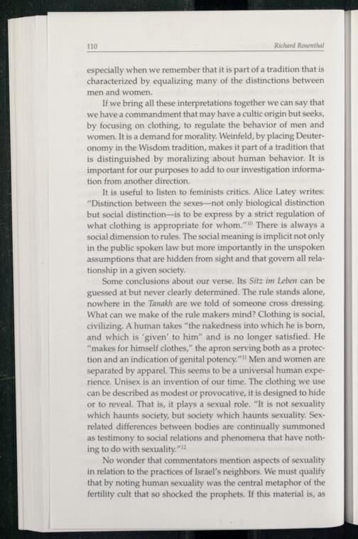 If we bring all these interpretations together we can say that we have a commandment that may have a cultic origin but seeks, by focusing on clothing, to regulate the behavior of men and women. It is a demand for morality. Weinfeld, by placing Deuter onomy in the Wisdom tradition, makes it part of a tradition that is distinguished by moralizing about human behavior. It is important for our purposes to add to our investigation information from another direction.