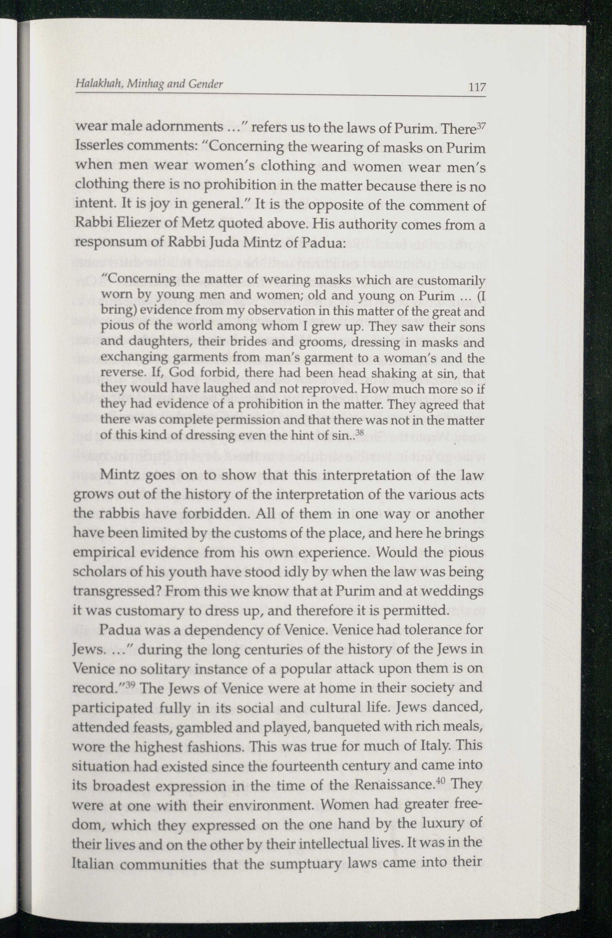 Mintz goes on to show that this interpretation of the law grows out of the history of the interpretation of the various acts the rabbis have forbidden. All of them in one way or another have been limited by the customs of the place, and here he brings empirical evidence from his own experience. Would the pious scholars of his youth have stood idly by when the law was being transgressed? From this we know that at Purim and at weddings it was customary to dress up, and therefore it is permitted.