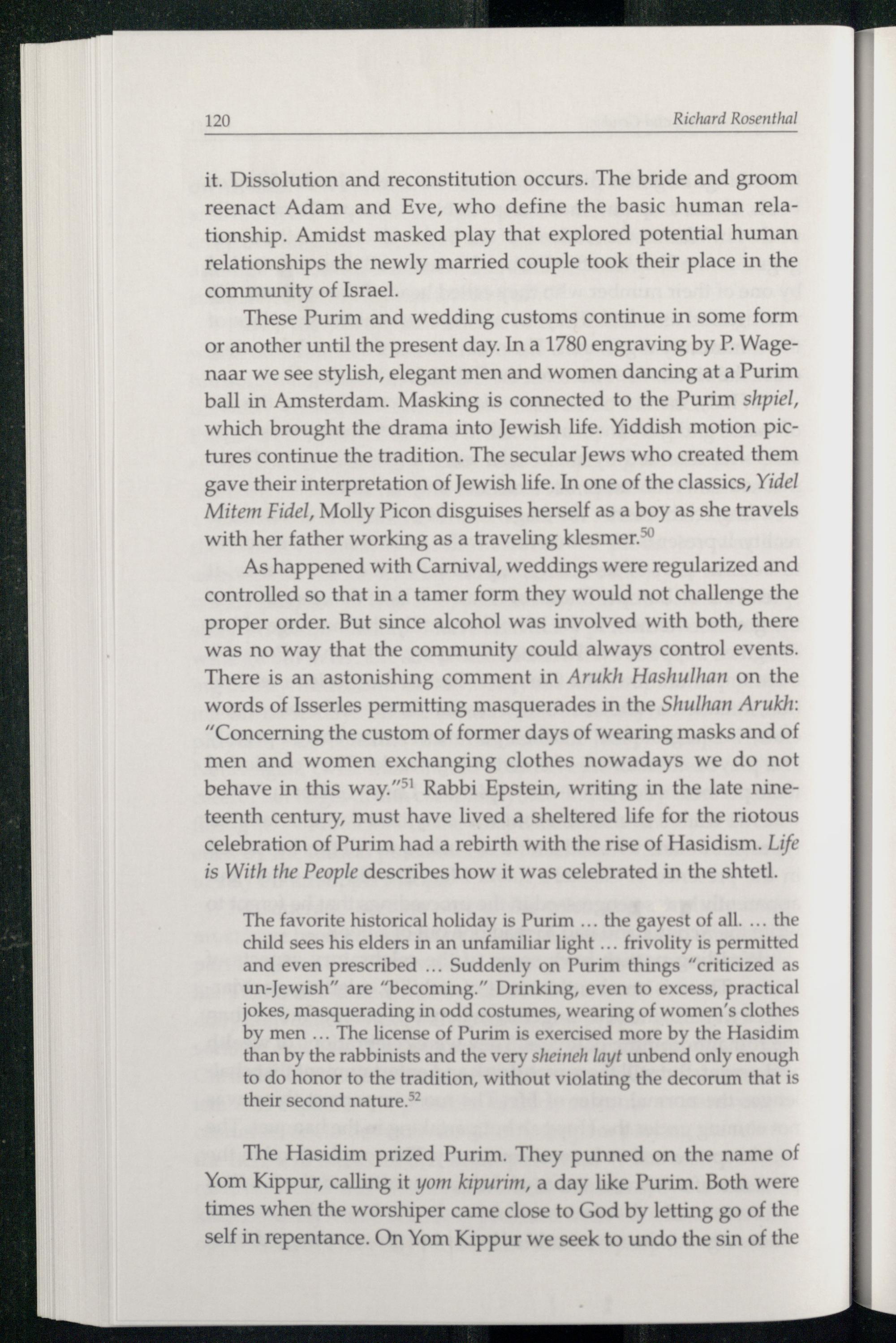 As happened with Carnival, weddings were regularized and controlled so that in a tamer form they would not challenge the proper order. But since alcohol was involved with both, there was no way that the community could always control events. There is an astonishing comment in Arukh Hashulhan on the words of Isserles permitting masquerades in the Shulhan Arukh: “Concerning the custom of former days of wearing masks and of men and women exchanging clothes nowadays we do not behave in this way.””' Rabbi Epstein, writing in the late nineteenth century, must have lived a sheltered life for the riotous celebration of Purim had a rebirth with the rise of Hasidism . Life is With the People describes how it was celebrated in the shtetl.