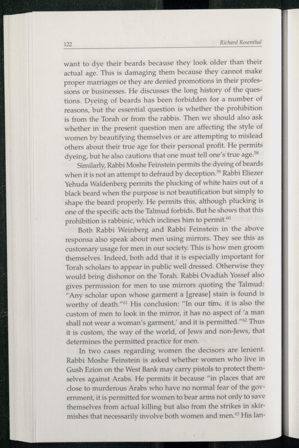 want to dye their beards because they look older than their actual age. This is damaging them because they cannot make proper marriages or they are denied promotions in their professions or businesses. He discusses the long history of the questions. Dyeing of beards has been forbidden for a number of reasons, but the essential question is whether the prohibition is from the Torah or from the rabbis. Then we should also ask whether in the present question men are affecting the style of women by beautifying themselves or are attempting to mislead others about their true age for their personal profit. He permits dyeing, but he also cautions that one must tell one’s true age.”