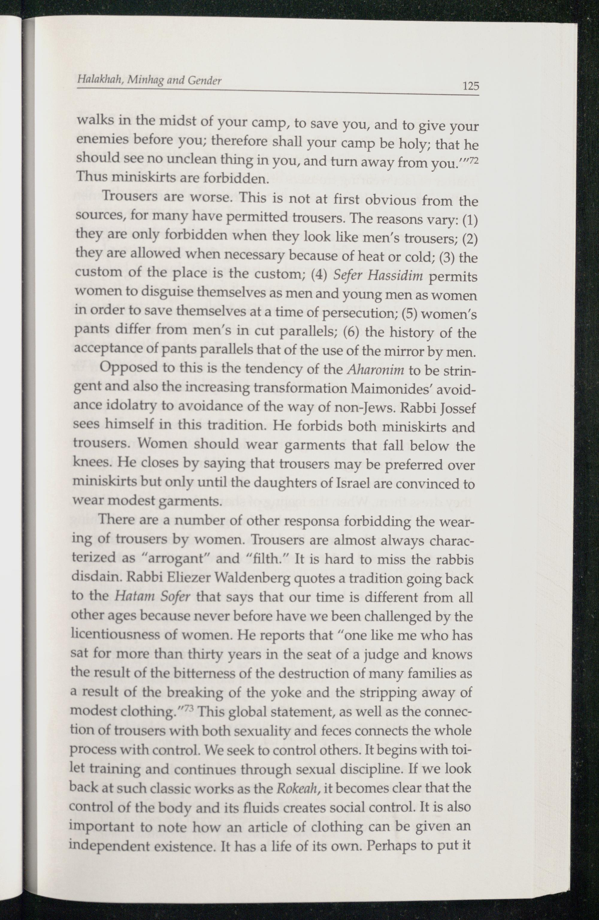 There are a number of other responsa forbidding the wearing of trousers by women. Trousers are almost always characterized as“arrogant” and“filth.” It is hard to miss the rabbis disdain. Rabbi Eliezer Waldenberg quotes a tradition going back to the Hatam Sofer that says that our time is different from all other ages because never before have we been challenged by the licentiousness of women. He reports that“one like me who has sat for more than thirty years in the seat of a judge and knows the result of the bitterness of the destruction of many families as a result of the breaking of the yoke and the stripping away of modest clothing.””* This global statement, as well as the connection of trousers with both sexuality and feces connects the whole process with control. We seek to control others. It begins with toilet training and continues through sexual discipline. If we look back at such classic works as the Rokeah, it becomes clear that the control of the body and its fluids creates social control. It is also important to note how an article of clothing can be given an independent existence. It has a life of its own. Perhaps to put it