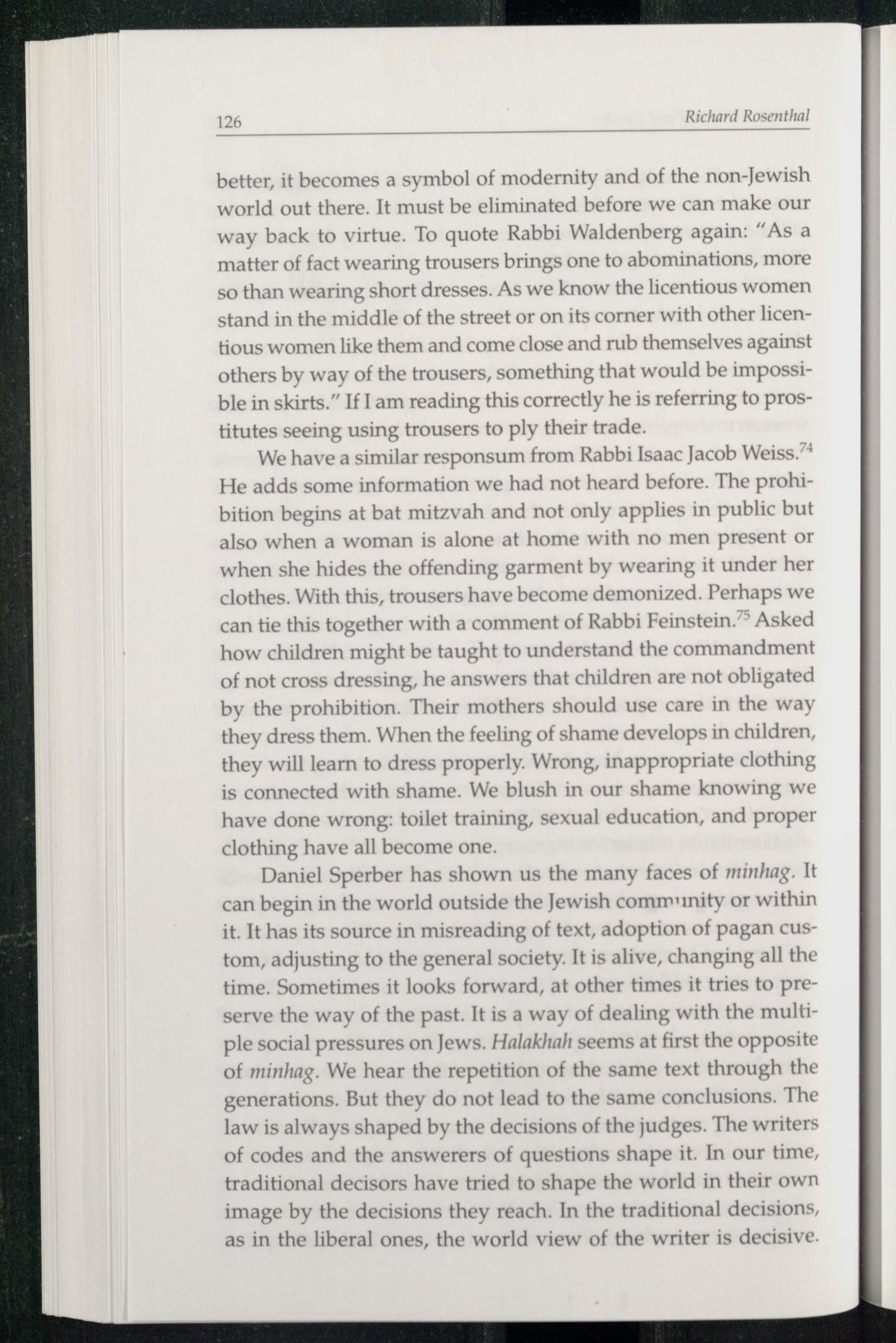 We have a similar responsum from Rabbi Isaac Jacob Weiss. a He adds some information we had not heard before. The prohibition begins at bat mitzvah and not only applies in public but also when a woman is alone at home with no men present or when she hides the offending garment by wearing it under her clothes. With this, trousers have become demonized. Perhaps we can tie this together with a comment of Rabbi Feinstein.” Asked how children might be taught to understand the commandment of not cross dressing, he answers that children are not obligated by the prohibition. Their mothers should use care in the way they dress them. When the feeling of shame develops in children, they will learn to dress properly. Wrong, inappropriate clothing is connected with shame. We blush in our shame knowing we have done wrong: toilet training, sexual education, and proper clothing have all become one.