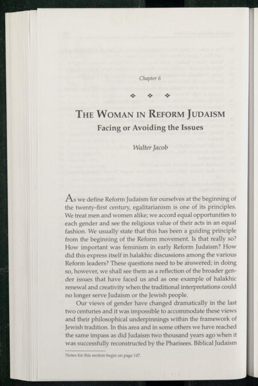 As we define Reform Judaism for ourselves at the beginning of the twenty-first century, egalitarianism is one of its principles. We treat men and women alike; we accord equal opportunities to each gender and see the religious value of their acts in an equal fashion. We usually state that this has been a guiding principle from the beginning of the Reform movement. Is that really so? How important was feminism in early Reform Judaism ? How did this express itself in halakhic discussions among the various Reform leaders? These questions need to be answered; in doing so, however, we shall see them as a reflection of the broader gender issues that have faced us and as one example of halakhic renewal and creativity when the traditional interpretations could no longer serve Judaism or the Jewish people.