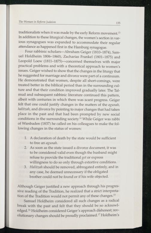 Four rabbinic scholars—Abraham Geiger (1810-1874), Sam uel Holdheim 1806-1860), Zacharias Frankel (1801-1875) and Leopold Loew (1811-1875)—concerned themselves with major practical problems and with a theoretical approach to women’s issues. Geiger wished to show that the changes in the liturgy that he suggested for marriage and divorce were part of a continuum. He demonstrated that women, despite all short-comings, were treated better in the biblical period than in the surrounding culture and that their condition improved gradually later. The Tal mud and subsequent rabbinic literature continued this pattern, albeit with centuries in which there was scant progress. Geiger felt that one could justify changes in the matters of the agunah, halitzah, and divorce by pointing to major changes that had taken place in the past and that had been prompted by new social conditions in the surrounding society.'* While Geiger was rabbi of Wiesbaden (1837) he called on his colleagues to make the fol