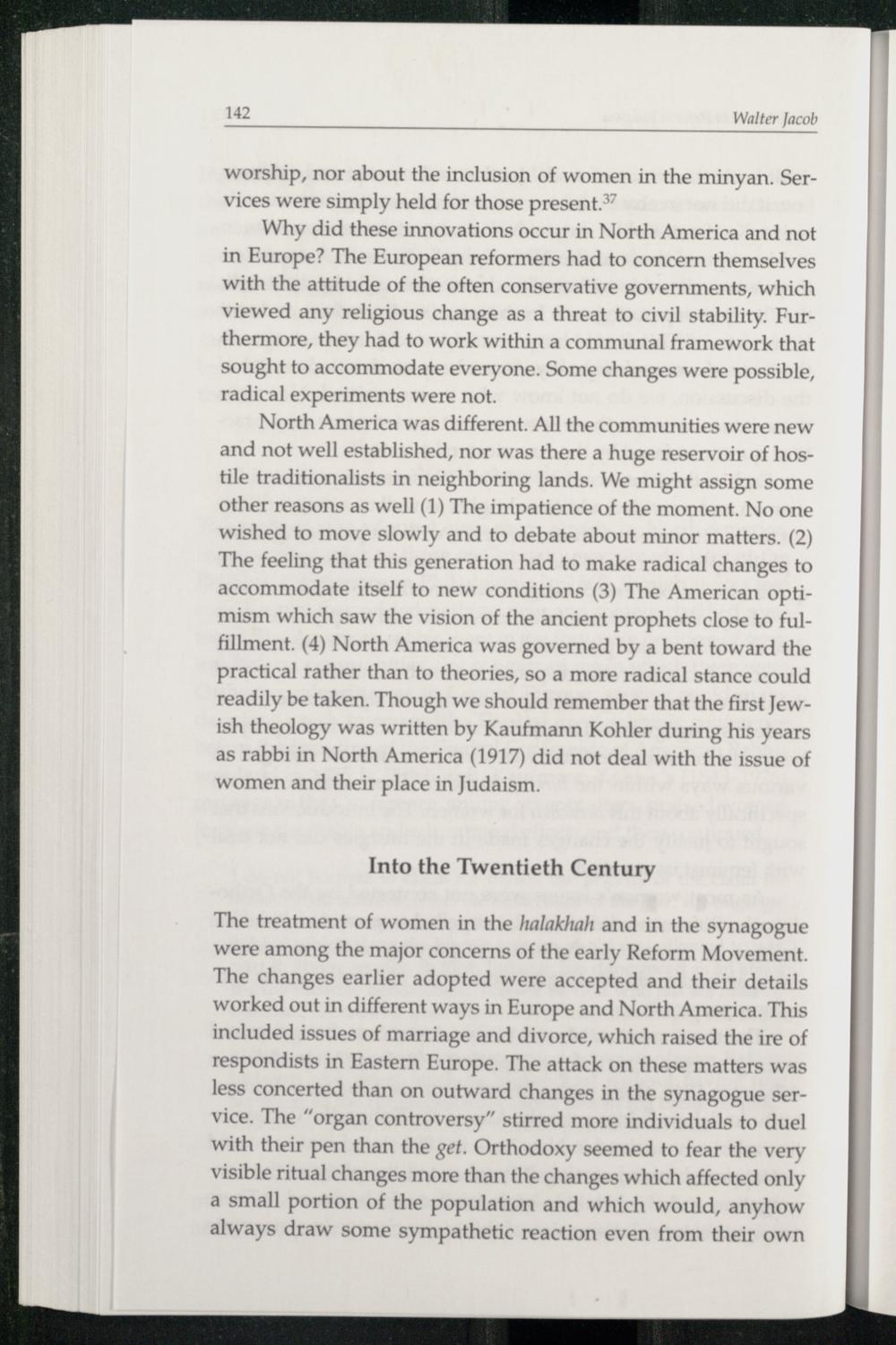 The treatment of women in the halakhah and in the synagogue were among the major concerns of the early Reform Movement. The changes earlier adopted were accepted and their details worked out in different ways in Europe and North America . This included issues of marriage and divorce, which raised the ire of respondists in Eastern Europe . The attack on these matters was less concerted than on outward changes in the synagogue service. The“organ controversy” stirred more individuals to duel with their pen than the get. Orthodoxy seemed to fear the very visible ritual changes more than the changes which affected only a small portion of the population and which would, anyhow always draw some sympathetic reaction even from their own