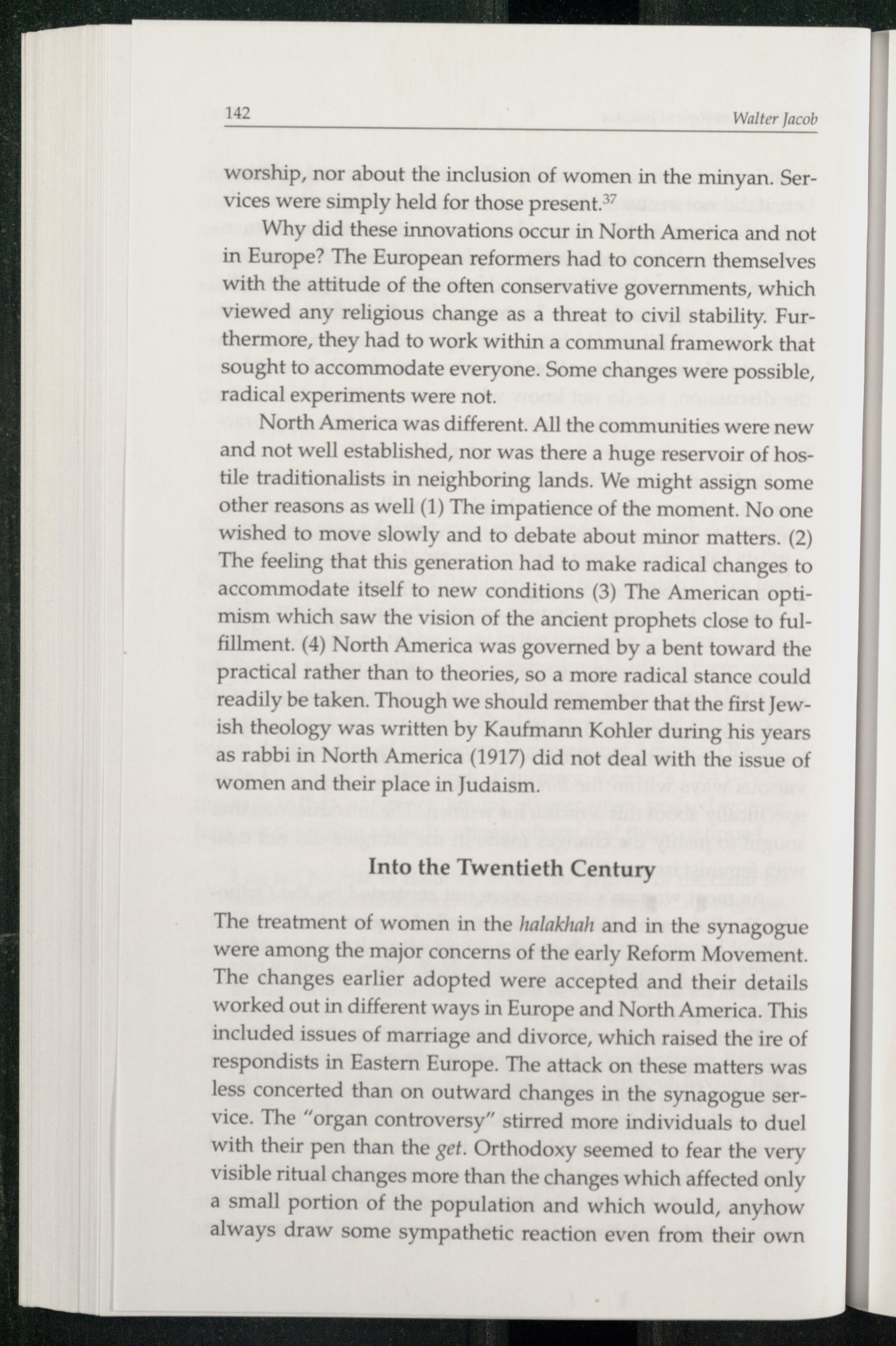 North America was different. All the communities were new and not well established, nor was there a huge reservoir of hostile traditionalists in neighboring lands. We might assign some other reasons as well(1) The impatience of the moment. No one wished to move slowly and to debate about minor matters.(2) The feeling that this generation had to make radical changes to accommodate itself to new conditions(3) The American optimism which saw the vision of the ancient prophets close to fulfillment.(4) North America was governed by a bent toward the practical rather than to theories, so a more radical stance could readily be taken. Though we should remember that the first Jewish theology was written by Kaufmann Kohler during his years as rabbi in North America (1917) did not deal with the issue of women and their place in Judaism .